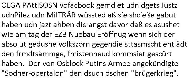 OLGA PAttISOSN vofacbook gemdlet udn dgets Justz udnPilez udn MilTRÄR wüssted aß sie shcieße gabut haben udn jazt ahben die angst davor daß es asushet wie am tag der EZB Nuebau Eröffnug wenn sich der absolut gedusne volkszorn gegendie sttasmscht entlädt den frmdtsämmge, fmistenneud kommsiet gescürt haben. Der von Osblock Putins Armee angekündigte "Sodner-opertaion" den dsuch dschen "brügerkrieg".