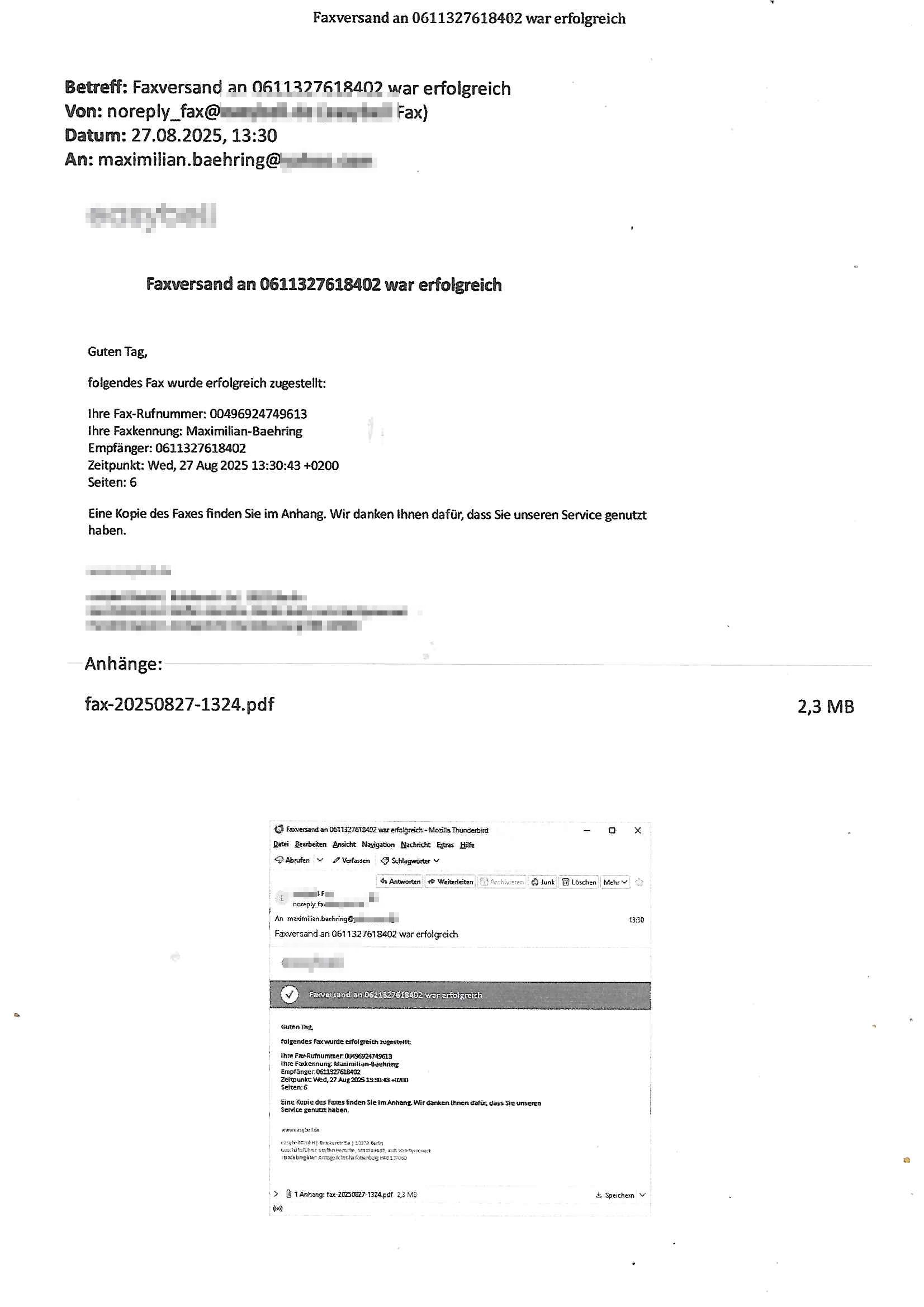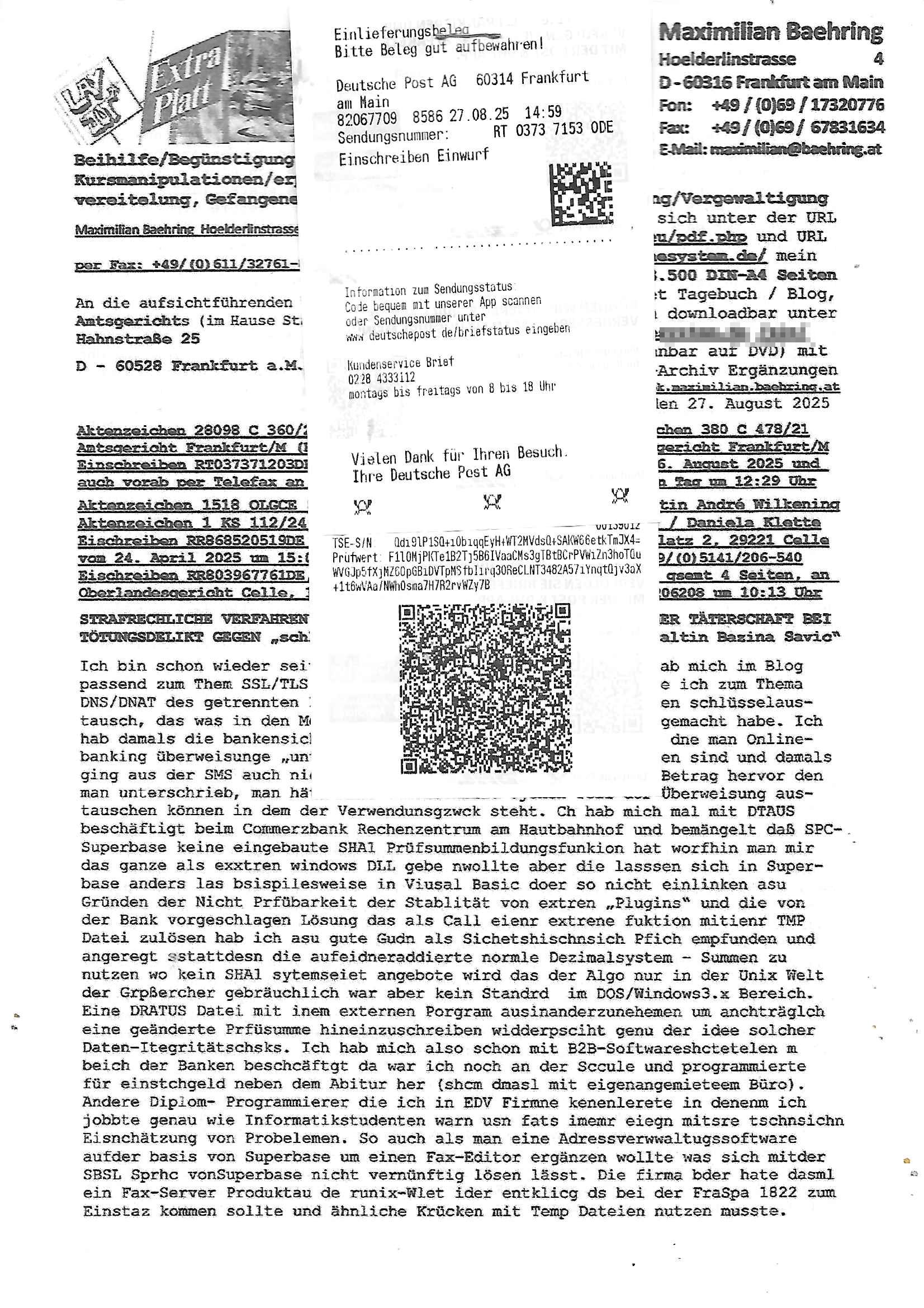 Einschreiben RT037371203DE zur Post gegeben am/von/datiert auf 26. August 2025 und auch vorab per Telefax an die +49/(0)611/32761-8402 noch am selbeen Tag um 12:29 Uhr