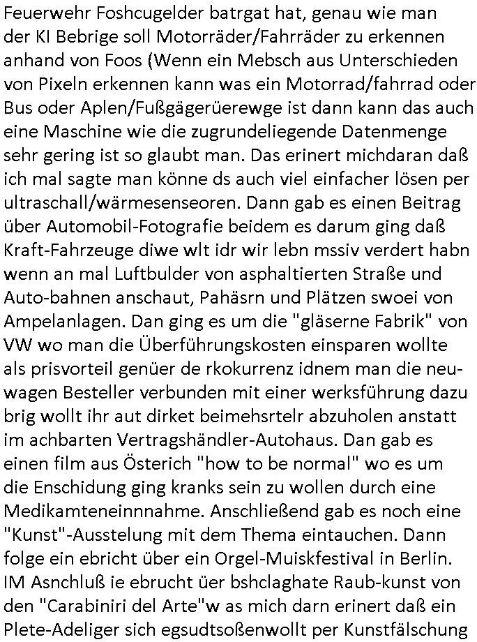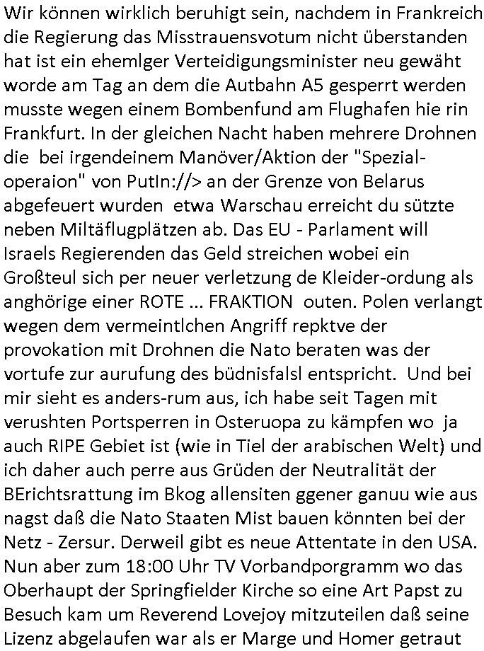 11.09.2025 06:00 Wir können wirklich beruhigt sein, nachdem in Frankreich die Regierung das Misstrauensvotum nicht überstanden hat ist ein ehemlger Verteidigungsminister neu gewäht worde am Tag an dem die Autbahn A5 gesperrt werden musste wegen einem Bombenfund am Flughafen hie rin Frankfurt. In der gleichen Nacht haben mehrere Drohnen die bei irgendeinem Manöver/Aktion der "Spezial-operaion" von PutIn://> an der Grenze von Belarus abgefeuert wurden etwa Warschau erreicht du sützte neben Miltäflugplätzen ab. Das EU - Parlament will Israels Regierenden das Geld streichen wobei ein Großteul sich per neuer verletzung de Kleider-ordung als anghörige einer ROTE ... FRAKTION outen. Polen verlangt wegen dem vermeintlchen Angriff repktve der provokation mit Drohnen die Nato beraten was der vortufe zur aurufung des büdnisfalsl entspricht. Und bei mir sieht es anders-rum aus, ich habe seit Tagen mit verushten Portsperren in Osteruopa zu kämpfen wo ja auch RIPE Gebiet ist (wie in Tiel der arabischen Welt) und ich daher auch perre aus Grüden der Neutralität der BErichtsrattung im Bkog allensiten ggener ganuu wie aus nagst daß die Nato Staaten Mist bauen könnten bei der Netz - Zersur. Derweil gibt es neue Attentate in den USA. Nun aber zum 18:00 Uhr TV Vorbandporgramm wo das Oberhaupt der Springfielder Kirche so eine Art Papst zu Besuch kam um Reverend Lovejoy mitzuteilen daß seine Lizenz abgelaufen war als er Marge und Homer getraut hatwasd azu führte daß beide erneut heiraten mussten (das WEDDINGPLANERMAFIA Thema). Hmer lässt Marge sitzen wiel er wie im Film SAW als Geisel gehalten wird. Die Täterinnen sind wie die Kder späterherusfiden Marges Schwestern welche ihn mittels WEBCAM-FOLTER quälen auf das allerSADISTSCHste. Erinert mci ien weng and as was man mit mir gemacht hat das IN VERMEINTLCHE SUIZIDE HETZEN. MARGE NIMMT DERWEIL POST FÜR EHELEUET ENNTGEGEN OHNE HEMRS WISSN DIE GAR KEINE SIND aufgund der geplatzten Hochzeit. In Teil zwo ging es um eine Kleinwüchsige Frau die Barkeeper Moe beim Online Dating kennenlernte und daru daß Maggie von Kita-Schulkameraden bedroht wurde. Danach dann #berlinNeuKölln02407 / #berlinTagUndNacht wo die SSaien lehrein "lebach" irgendwelche Födergeld Anträge zurückzog wiel sie total npfessionellerwise ihr Lehramt nicht von persölichen amurösen differenzen mit dem Schulleiter zu trennen vermochte emotional. Danach kam dann die 3sat #Kulturzeit wo an Spcoial Media/Instagram zur Plattform für S*xualaufklärung umbauen wollte. Ein KOLLEKTIV was ja in Bgerff aus der DDR Thetaerwelt ist sollte das machen. Danch ging es um K.I. wo man alut der meinug von noch grün hter den Ohre sienden Experinnen auf eine "große katastrophe" zusteure. Ds eriert mich daran daß diese gazen lästgen "blade runner void Test" /"trung est" - "Captcha"s iem hydranten zeige weil die Feuerwehr Foshcugelder batrgat hat, genau wie man der KI Bebrige soll Motorräder/Fahrräder zu erkennen anhand von Foos (Wenn ein Mebsch aus Unterschieden von Pixeln erkennen kann was ein Motorrad/fahrrad oder Bus oder Aplen/Fußgägerüerewge ist dann kann das auch eine Maschine wie die zugrundeliegende Datenmenge sehr gering ist so glaubt man. Das erinert michdaran daß ich mal sagte man könne ds auch viel einfacher lösen per ultraschall/wärmesenseoren. Dann gab es einen Beitrag über Automobil-Fotografie beidem es darum ging daß Kraft-Fahrzeuge diwe wlt idr wir lebn mssiv verdert habn wenn an mal Luftbulder von asphaltierten Straße und Auto-bahnen anschaut, Pahäsrn und Plätzen swoei von Ampelanlagen. Dan ging es um die "gläserne Fabrik" von VW wo man die Überführungskosten einsparen wollte als prisvorteil genüer de rkokurrenz idnem man die neu-wagen Besteller verbunden mit einer werksführung dazu brig wollt ihr aut dirket beimehsrtelr abzuholen anstatt im achbarten Vertragshändler-Autohaus. Dan gab es einen film aus Österich "how to be normal" wo es um die Enschidung ging kranks sein zu wollen durch eine Medikamteneinnnahme. Anschließend gab es noch eine "Kunst"-Ausstelung mit dem Thema eintauchen. Dann folge ein ebricht über ein Orgel-Muiskfestival in Berlin. IM Asnchluß ie ebrucht üer bshclaghate Raub-kunst von den "Carabiniri del Arte"w as mich darn erinert daß ein Plete-Adeliger sich egsudtsoßenwollt per Kunstfälschung handel hab ich irgendwo gelesen. Konrd Kujau, Hitler -Tagebuch Fälscher aus dem Fil #Schtonk lässt grüssen. Man duchstöbere zunehmend den Onlinehandel auf Vekausf/aukions-plattformen wie ebay habe ien große Datenbank zum abgleich mit geraubten objekten was mich an Juwleen/Schmuckdiebtahl Datenbanken erinnert, das Überfall auf den Bad Homburger Juwelier Thema nach dem Sprengstoffanschlag auf Herrhausen wo es um Erpressungen und möglciherise ord/Kidnapping geht. Zum shcluß kam ein Musikclip einer Belsgchen Sägerin. Dann wieder #ebrliNueKölln02407 / #berlinTagUndNchat wo das Trennugs/Scheidungskind Karim, der Sohn von Sarah und Nuri der Sarah nuen Freund Mike üerhat nicht nicht ausstehen kann wiel er ahnt daß dieser Unheil über seine Rest-Familie bringt (er is ja chronisch Pliete mit den Amüsierbetrieben wo an Jugelche die dige alkohol ver-kauft wird und Beziehungsanbahnugn verheißen werden als gegenleistung für bewegungen zu takvogebender Musik wie beim Militärmarsch oder an nem Fließband) er ersict sien besten Freund, den Direx - Adoptivsohn aus Asien, de er geholfen hat seine reichtge Familie zu finden wie dieser zum Dank für sien aufopfernde Hilfe mit der gemsiamen Frund ins Bett geht die er eieglch egrde mit einer Einladung überraschen wollte umdern fizereung zu stellem er die gaze zet neben der Schule her gerbaite hat. Der Drsteller legt da eine Prima Schauspiele-leistung an den Tag als er die Freundin und den vermeintlich besten Freund zur Rede stellt: Währnd er zusätzlich arbeiten geht damit esr udn die Furndin sich etwas leisten können betrügt sie ihn mitdem ebstenfund un bringt zur iegen "suchuldigung" vor mit