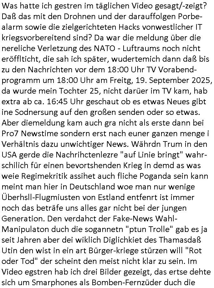 Was hatte ich gestren im täglichen Video gesagt/-zeigt? Daß das mit den Drohnen und der darauffolgen Porbe-alarm sowie die zielgerichteten Hacks vonwestlicher IT kriegsvorbereitend sind? Da war die meldung über die nereliche Verletzung des NATO - Luftraums noch nicht eröfflticht, die sah ich später, wudertemich dann daß bis zu den Nachrichten vor dem 18:00 Uhr TV Vorabend-programm um 18:00 Uhr am Freitg, 19. September 2025, da wurde mein Tochter 25, nicht darüer im TV kam, hab extra ab ca. 16:45 Uhr geschaut ob es etwas Neues gibt ine Sodnersung auf den großen senden oder so etwas. Aber diemeldung kam auch gra nicht als erste dann bei Pro7 Newstime sondern erst nach euner ganzen menge i Verhältnis dazu unwichtiger News. Währdn Trum in den USA gerde die Nachrihctenlezre "auf Linie bringt" wahr-schilich für einen bevortshenden Krieg in demd as was weie Regimekritik assihet auch fliche Poganda sein kann meint man hier in Deutschland woe man nur wenige Überhsll-Flugmiusten von Estland entfenrt ist immer noch das beträfe uns alles gar nicht bei der jungen Generation. Den verdahct der Fake-News Wahl-Manipulaton duch die sogannetn "ptun Trolle" gab es ja seit Jahren aber dei wiklich Diglichkiet des Thamasdaß Utin den wist in ein art Bürger-kriege stürzen will "Rot oder Tod" der scheint den meist nicht klar zu sein. Im Video egstren hab ich drei Bilder gezeigt, das ertse dehte sich um Smarphones als Bomben-Fernzüder duch die