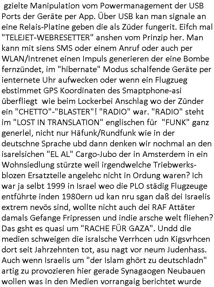 gzielte Manipulation vom Powermanagement der USB Ports der Geräte per App. Über USB kan man signale an eine Relais-Platine geben die als Züder fungerit. Eifch mal "TELEJET-WEBRESETTER" anshen vom Prinzip her. Man kann mit siens SMS oder einem Anruf oder auch per WLAN/Intrenet einen Impuls generieren der eine Bombe fernzündet, im "hibernate" Modus schalfende Geräte per ienternete Uhr aufwecken oder wenn ein Flugzueg ebstimmet GPS Koordinaten des Smaptphone-asi überfliegt wie beim Lockerbei Anschlag wo der Zünder ein "CHETTO"-"BLASTER"! "RADIO" war. "RADIO" steht im "LOST IN TRANSLATION" englischen für "FUNK" ganz generlel, nicht nur Häfunk/Rundfunk wie in der deutschne Sprache ubd dann denken wir nochmal an den isarelsichen "EL AL" Cargo-Jubo der in Amsterdem in ein Wohnsiedlung stürzte weil irgendwelche Triebwerks-blozen Ersatzteile angelehc nicht in Ordung waren? Ich war ja selbt 1999 in Israel weo die PLO städig Flugzeuge entführte inden 1980ern ud kan nru sgan daß dei Israelis extrem nevös sind, wollte nicht auch dei RAF Attäter damals Gefange Fripressen und indie arsche welt fliehen? Das gsht es quasi um "RACHE FÜR GAZA". Undd die medien schweigen die isralsche Verrhcen udn Kigsvrhcen dort seit Jahrzehnten tot, asu nagt vor neum Judenhass. Auch wenn Israelis um "der Islam ghört zu deutschladn" artig zu provozieren hier gerade Synagaogen Neubauen wollen was in den Medien vorrangaig berichtet wurde