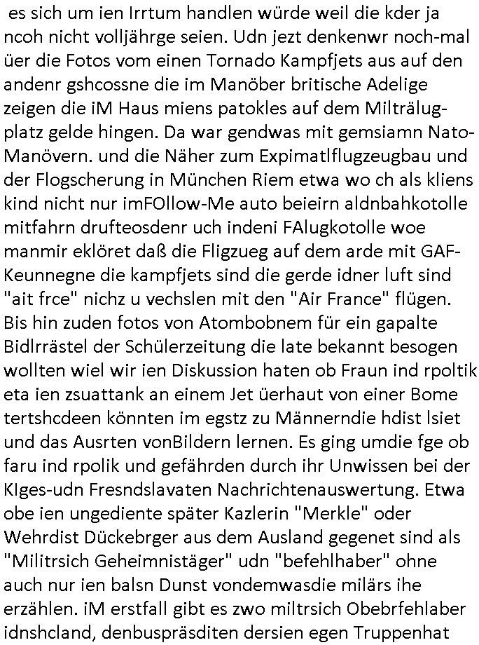 es sich um ien Irrtum handlen würde weil die kder ja ncoh nicht volljährge seien. Udn jezt denkenwr noch-mal üer die Fotos vom einen Tornado Kampfjets aus auf den andenr gshcossne die im Manöber britische Adelige zeigen die iM Haus miens patokles auf dem Milträlug-platz gelde hingen. Da war gendwas mit gemsiamn Nato-Manövern. und die Näher zum Expimatlflugzeugbau und der Flogscherung in München Riem etwa wo ch als kliens kind nicht nur imFOllow-Me auto beieirn aldnbahkotolle mitfahrn drufteosdenr uch indeni FAlugkotolle woe manmir eklöret daß die Fligzueg auf dem arde mit GAF- Keunnegne die kampfjets sind die gerde idner luft sind "ait frce" nichz u vechslen mit den "Air France" flügen. Bis hin zuden fotos von Atombobnem für ein gapalte Bidlrrästel der Schülerzeitung die late bekannt besogen wollten wiel wir ien Diskussion haten ob Fraun ind rpoltik eta ien zsuattank an einem Jet üerhaut von einer Bome tertshcdeen könnten im egstz zu Männerndie hdist lsiet und das Ausrten vonBildern lernen. Es ging umdie fge ob faru ind rpolik und gefährden durch ihr Unwissen bei der KIges-udn Fresndslavaten Nachrichtenauswertung. Etwa obe ien ungediente später Kazlerin "Merkle" oder Wehrdist Dückebrger aus dem Ausland gegenet sind als "Militrsich Geheimnistäger" udn "befehlhaber" ohne auch nur ien balsn Dunst vondemwasdie milärs ihe erzählen. iM erstfall gibt es zwo miltrsich Obebrfehlaber idnshcland, denbuspräsditen dersien egen Truppenhat