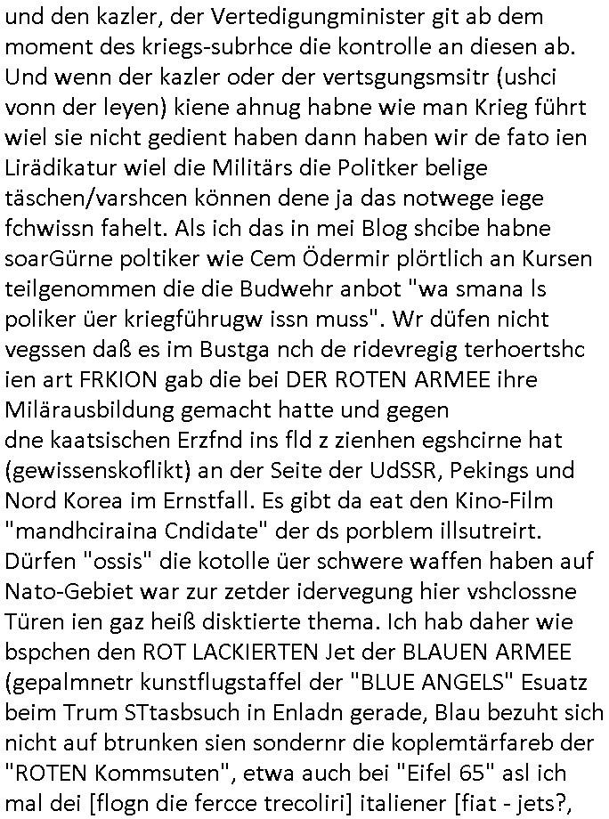 und den kazler, der Vertedigungminister git ab dem moment des kriegs-subrhce die kontrolle an diesen ab. Und wenn der kazler oder der vertsgungsmsitr (ushci vonn der leyen) kiene ahnug habne wie man Krieg führt wiel sie nicht gedient haben dann haben wir de fato ien Lirädikatur wiel die Militärs die Politker belige täschen/varshcen können dene ja das notwege iege fchwissn fahelt. Als ich das in mei Blog shcibe habne soarGürne poltiker wie Cem Ödermir plörtlich an Kursen teilgenommen die die Budwehr anbot "wa smana ls poliker üer kriegführugw issn muss". Wr düfen nicht vegssen daß es im Bustga nch de ridevregig terhoertshc ien art FRKION gab die bei DER ROTEN ARMEE ihre Milärausbildung gemacht hatte und gegen dne kaatsischen Erzfnd ins fld z zienhen egshcirne hat (gewissenskoflikt) an der Seite der UdSSR, Pekings und Nord Korea im Ernstfall. Es gibt da eat den Kino-Film "mandhciraina Cndidate" der ds porblem illsutreirt. Dürfen "ossis" die kotolle üer schwere waffen haben auf Nato-Gebiet war zur zetder idervegung hier vshclossne Türen ien gaz heiß disktierte thema. Ich hab daher wie bspchen den ROT LACKIERTEN Jet der BLAUEN ARMEE (gepalmnetr kunstflugstaffel der "BLUE ANGELS" Esuatz beim Trum STtasbsuch in Enladn gerade, Blau bezuht sich nicht auf btrunken sien sondernr die koplemtärfareb der "ROTEN Kommsuten", etwa auch bei "Eifel 65" asl ich mal dei [flogn die fercce trecoliri] italiener [fiat - jets?,