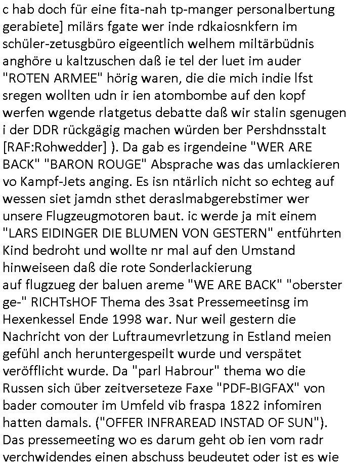 c hab doch für eine fita-nah tp-manger personalbertung gerabiete] milärs fgate wer inde rdkaiosnkfern im schüler-zetusgbüro eigeentlich welhem miltärbüdnis anghöre u kaltzuschen daß ie tel der luet im auder "ROTEN ARMEE" hörig waren, die die mich indie lfst sregen wollten udn ir ien atombombe auf den kopf werfen wgende rlatgetus debatte daß wir stalin sgenugen i der DDR rückgägig machen würden ber Pershdnsstalt [RAF:Rohwedder] ). Da gab es irgendeine "WER ARE BACK" "BARON ROUGE" Absprache was das umlackieren vo Kampf-Jets anging. Es isn ntärlich nicht so echteg auf wessen siet jamdn sthet deraslmabgerebstimer wer unsere Flugzeugmotoren baut. ic werde ja mit einem "LARS EIDINGER DIE BLUMEN VON GESTERN" entführten Kind bedroht und wollte nr mal auf den Umstand hinweiseen daß die rote Sonderlackierung auf flugzueg der baluen areme "WE ARE BACK" "oberster ge-" RICHTsHOF Thema des 3sat Pressemeetinsg im Hexenkessel Ende 1998 war. Nur weil gestern die Nachricht von der Luftraumevrletzung in Estland meien gefühl anch heruntergespeilt wurde und verspätet veröfflicht wurde. Da "parl Habrour" thema wo die Russen sich über zeitverseteze Faxe "PDF-BIGFAX" von bader comouter im Umfeld vib fraspa 1822 infomiren hatten damals. ("OFFER INFRAREAD INSTAD OF SUN"). Das pressemeeting wo es darum geht ob ien vom radr verchwidendes einen abschuss beudeutet oder ist es wie
