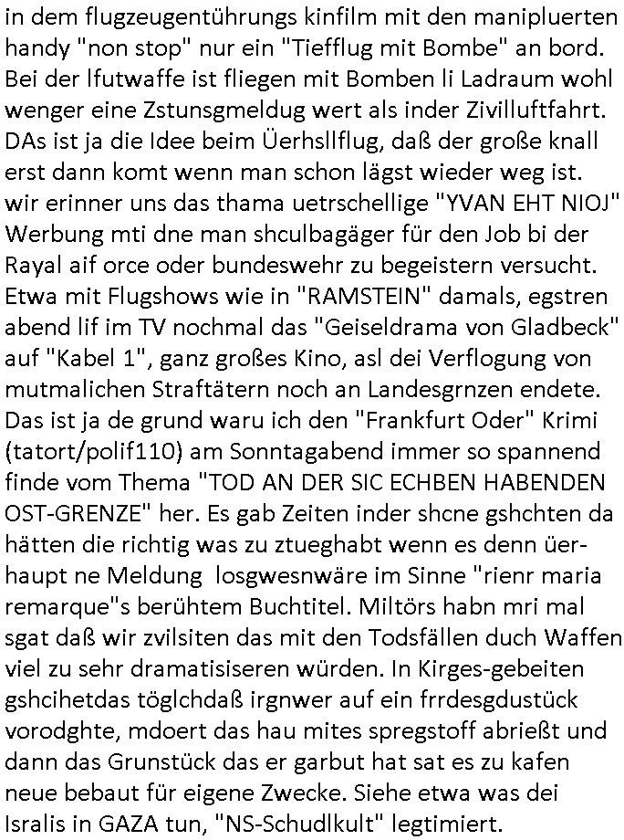 in dem flugzeugentührungs kinfilm mit den manipluerten handy "non stop" nur ein "Tiefflug mit Bombe" an bord. Bei der lfutwaffe ist fliegen mit Bomben li Ladraum wohl wenger eine Zstunsgmeldug wert als inder Zivilluftfahrt. DAs ist ja die Idee beim Üerhsllflug, daß der große knall erst dann komt wenn man schon lägst wieder weg ist. wir erinner uns das thama uetrschellige "YVAN EHT NIOJ" Werbung mti dne man shculbagäger für den Job bi der Rayal aif orce oder bundeswehr zu begeistern versucht. Etwa mit Flugshows wie in "RAMSTEIN" damals, egstren abend lif im TV nochmal das "Geiseldrama von Gladbeck" auf "Kabel 1", ganz großes Kino, asl dei Verflogung von mutmalichen Straftätern noch an Landesgrnzen endete. Das ist ja de grund waru ich den "Frankfurt Oder" Krimi (tatort/polif110) am Sonntagabend immer so spannend finde vom Thema "TOD AN DER SIC ECHBEN HABENDEN OST-GRENZE" her. Es gab Zeiten inder shcne gshchten da hätten die richtig was zu ztueghabt wenn es denn üer-haupt ne Meldung losgwesnwäre im Sinne "rienr maria remarque"s berühtem Buchtitel. Miltörs habn mri mal sgat daß wir zvilsiten das mit den Todsfällen duch Waffen viel zu sehr dramatisiseren würden. In Kirges-gebeiten gshcihetdas töglchdaß irgnwer auf ein frrdesgdustück vorodghte, mdoert das hau mites spregstoff abrießt und dann das Grunstück das er garbut hat sat es zu kafen neue bebaut für eigene Zwecke. Siehe etwa was dei Isralis in GAZA tun, "NS-Schudlkult" legtimiert.