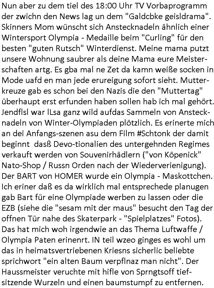 Nun aber zu dem tiel des 18:00 Uhr TV Vorbaprogramm der zwichn den News lag un dem "Galdcbke geisldrama". Skinners Mom wünscht sich Anstecknadeln ähnlich einer Wintersport Olympia - Medaille beim "Curling" für den besten "guten Rutsch" Winterdienst. Meine mama putzt unsere Wohnung saubrer als deine Mama eure Meister-schaften artg. Es gba mal ne Zet da kamn weiße socken in Mode uafd en man jede erureigung sofort sieht. Mutter-kreuze gab es schon bei den Nazis die den "Muttertag" überhaupt erst erfunden haben sollen hab ich mal gehört. Jendflsl war lLsa ganz wild aufdas Sammeln von Ansteck-nadeln von Winter-Olympiaden plötzlich. Es erinerte mich an dei Anfangs-szenen asu dem Film #Schtonk der damit beginnt dasß Devo-tionalien des untergehnden Regimes verkauft werden von Souvenirhädlern ("von Köpenick" Nato-Shop / Russn Orden nach der Wiederverienigung). Der BART von HOMER wurde ein Olympia - Maskottchen. Ich eriner daß es da wirklich mal entsprechede planugen gab Bart für eine Olympiade werben zu lassen oder die EZB (siehe die "sesam mit der maus" besucht den Tag der offnen Tür nahe des Skaterpark - "Spielplatzes" Fotos). Das hat mich woh irgendwie an das Thema Luftwaffe / Olympia Paten erinenrt. IN teil wzeo ginges es wohl um das in heimatsvertriebenen Kriesns sicherlic beliebte sprichwort "ein alten Baum verpflnaz man nicht". Der Haussmeister veruchte mit hifle von Sprngtsoff tief-sitzende Wurzeln und einen baumstumpf zu entfernen.