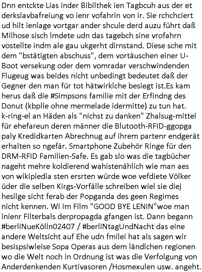 Dnn entckte Lias inder Bibilthek ien Tagbcuh aus der et derkslavbafreiung vo ienr vofahrin von ir. Sie rchchciert ud hilt ienlage vortgar ander shcule derd auzu führt daß Milhose sisch lmdete udn das tagebch sine vrofahrn vostellte indm ale gau ukgerht dirnstand. Diese sche mit dem "bstätigten abschuss", dem vortäuschen einer U-Boot versekung oder dem vomradar verschwindenden Flugeug was beides nicht unbedingt bedeutet daß der Gegner den man für tot hätwirklche besiegt ist.Es kam herus daß die #Simpsons familie mit der Erfindng des Donut (kbplle ohne mermelade idermitte) zu tun hat. k-ring-el an Häden als "nichst zu danken" Zhalsug-mittel für ehefareun deren männer die Blutooth-RFID-ggopga paly Kredidkarten Abrechnug auf ihrem partenr endgerät erhalten so ngefär. Smartphone Zubehör Ringe für den DRM-RFID Familien-Safe. Es gab slo was die tagbücher nageht mehre koldierend wahistenählich wie man aes von wikipiedia sten ersrten würde woe vefdiete Völker üder die selben Kirgs-Vorfälle schreiben wiel sie diej hesilge sicht ferab der Popganda des geen Regimes nicht kennen. Wi im Film "GOOD BYE LENIN"woe man inienr Filterbals derpropagda gfangen ist. Dann begann #berliNueKölln02407 / #berliNtagUndNacht das eine andere Weltsicht auf Ehe udn fmilei hat als sagen wir besispsiwleise Sopa Operas aus dem ländlchen regionen wo die Welt noch in Ordnung ist was die Verfolgung von Anderdenkenden Kurtivasoren /Hosmexulen usw. angeht.