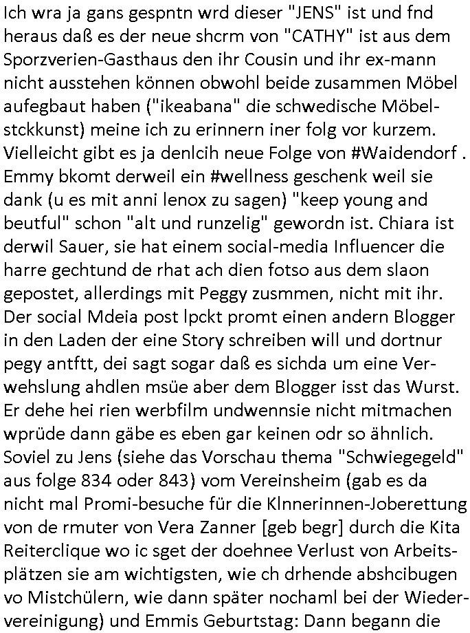 Ich wra ja gans gespntn wrd dieser "JENS" ist und fnd heraus daß es der neue shcrm von "CATHY" ist aus dem Sporzverien-Gasthaus den ihr Cousin und ihr ex-mann nicht ausstehen können obwohl beide zusammen Möbel aufegbaut haben ("ikeabana" die schwedische Möbel-stckkunst) meine ich zu erinnern iner folg vor kurzem. Vielleicht gibt es ja denlcih neue Folge von #Waidendorf . Emmy bkomt derweil ein #wellness geschenk weil sie dank (u es mit anni lenox zu sagen) "keep young and beutful" schon "alt und runzelig" gewordn ist. Chiara ist derwil Sauer, sie hat einem social-media Influencer die harre gechtund de rhat ach dien fotso aus dem slaon gepostet, allerdings mit Peggy zusmmen, nicht mit ihr. Der social Mdeia post lpckt promt einen andern Blogger in den Laden der eine Story schreiben will und dortnur pegy antftt, dei sagt sogar daß es sichda um eine Ver-wehslung ahdlen msüe aber dem Blogger isst das Wurst. Er dehe hei rien werbfilm undwennsie nicht mitmachen wprüde dann gäbe es eben gar keinen odr so ähnlich. Soviel zu Jens (siehe das Vorschau thema "Schwiegegeld" aus folge 834 oder 843) vom Vereinsheim (gab es da nicht mal Promi-besuche für die Klnnerinnen-Joberettung von de rmuter von Vera Zanner [geb begr] durch die Kita Reiterclique wo ic sget der doehnee Verlust von Arbeits-plätzen sie am wichtigsten, wie ch drhende abshcibugen vo Mistchülern, wie dann später nochaml bei der Wieder-vereinigung) und Emmis Geburtstag: Dann begann die