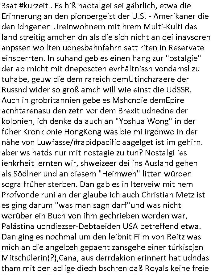 3sat #kurzeit . Es hiß naotalgei sei gährlich, etwa die Erinnerung an den pionoergeist der U.S. - Amerikaner die den idngenen Ureinwohnern mit hrem Multi-Kulti das land streitig amchen dn als die sich nicht an dei inavsoren anpssen wollten udnesbahnfahrn satt riten in Reservate einsperrten. In suhand geb es einen hang zur "ostalgie" der ab rnicht mit dneposcteh evrhältnissn vondamsl zu tuhabe, geuw die dem rareich demUtinchzraere der Russnd wider so groß amch will wie einst die UdSSR. Auch in grobritannien gebe es Mshcndie demEpire acnhtarenasu den zetn vor dem Brexit udnedne der kolonien, ich denke da auch an "Yoshua Wong" in der füher Kronklonie HongKong was bie mi irgdnwo in der nähe von Luwfasse/#rapidpacific aagelget ist im gehirn. aber ws hatds nur mit nostagie zu tun? Nostalgi ies ienkrheit lernten wir, shweizeer dei ins Ausland gehen als Södlner und an diesem "Heimweh" litten würden sogra früher sterben. Dan gab es in Iterveiw mit nem Profvonde runi an der glaube ich auch Christian Metz ist es ging darum "was man sagn darf"und was nicht worüber ein Buch von ihm gechrieben worden war, Palästina udndiezser-Debtaeiden USA betreffend etwa. Dan ging es nochmal um den leibnit Film von Reitz was mich an die angelceh gepaent zansgehe einer türkiscjen Mitschülerin(?),Cana, aus derrdakion erinnert hat udndas tham mit den adlige diech bschren daß Royals keine freie Partnerwahl hätten wen es u Krge udnfrd geh duchdas