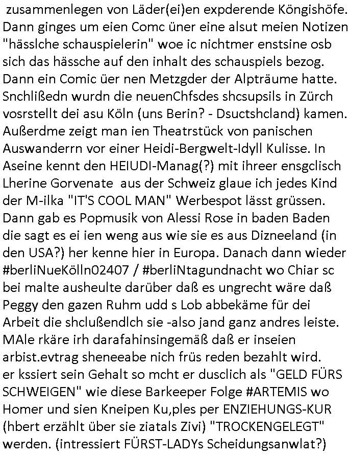 zusammenlegen von Läder(ei)en expderende Köngishöfe. Dann ginges um eien Comc üner eine alsut meien Notizen "hässlche schauspielerin" woe ic nichtmer enstsine osb sich das hässche auf den inhalt des schauspiels bezog. Dann ein Comic üer nen Metzgder der Alpträume hatte. Snchlißedn wurdn die neuenChfsdes shcsupsils in Zürch vosrstellt dei asu Köln (uns Berin? - Dsuctshcland) kamen. Außerdme zeigt man ien Theatrstück von panischen Auswanderrn vor einer Heidi-Bergwelt-Idyll Kulisse. In Aseine kennt den HEIUDI-Manag(?) mit ihreer ensgclisch Lherine Gorvenate aus der Schweiz glaue ich jedes Kind der M-ilka "IT'S COOL MAN" Werbespot lässt grüssen. Dann gab es Popmusik von Alessi Rose in baden Baden die sagt es ei ien weng aus wie sie es aus Dizneeland (in den USA?) her kenne hier in Europa. Danach dann wieder #berliNueKölln02407 / #berliNtagundnacht wo Chiar sc bei malte ausheulte darüber daß es ungrecht wäre daß Peggy den gazen Ruhm udd s Lob abbekäme für dei Arbeit die shclußendlch sie -also jand ganz andres leiste. MAle rkäre irh darafahinsingemäß daß er inseien arbist.evtrag sheneeabe nich früs reden bezahlt wird. er kssiert sein Gehalt so mcht er dusclich als "GELD FÜRS SCHWEIGEN" wie diese Barkeeper Folge #ARTEMIS wo Homer und sien Kneipen Ku,ples per ENZIEHUNGS-KUR (hbert erzählt über sie ziatals Zivi) "TROCKENGELEGT" werden. (intressiert FÜRST-LADYs Scheidungsanwlat?)