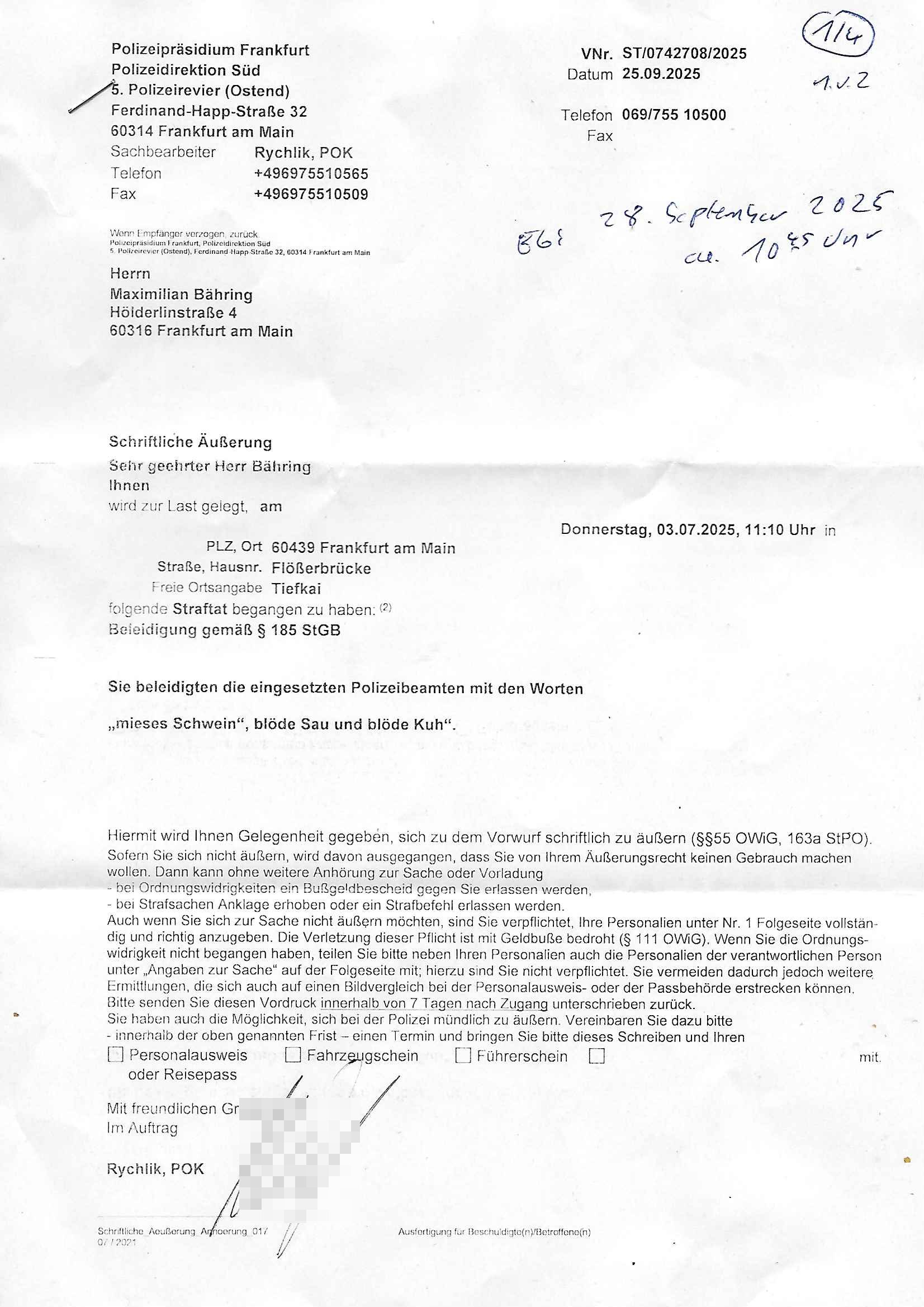 28.09.2025 15:00 Beihilfe/Begünstigung RAF–TERROR per Postunterschlagung Kursmanipulationen/erpresserischer Menschenraub/Straf-vereitelung, Gefangenenbefreiung, Zeugen-Medizinvergiftung/Vergewaltigung Maximilian Baehring Hoelderlinstrasse 4 D-60316 Frankfurt/M via LKA er Fax: +49/(0)611/327669122 An den Vorgesetzten POK Rychlinks Polizeipräsidium Frankfurt Polizeidieketion Süd 5. Polizeirevier (Ostend) Ferdinand-Happ-Straße 32 D - 60314 Frankfurt a.M. Im Internet findet sich unter der URL http://banktunnel.eu/pdf.php und URL http://blog.sch-einesystem.de/ mein ausgedruckt über 33.750 DIN-A4 Seiten umfassendes Internet Tagebuch / Blog, als Offline Version downloadbar unter http://*** /***/ als ISO-Image (brennbar auf DVD) mit tagesaktuellen ZIP-Archiv Ergänzungen geändert URL: http://tiktok.maximilian.baehring.at Frankfurt am Main, den 28. September 2025 V(organgs)N(umme)R ST/0742708/2025 Polizei Frankfurt am Main vom 25. September 2025/ V(organgs)N(umme)R ST/0742710/2025 Polizei Frankfurt am Main vom 25. September 2025 Zwo Schreiben, jeweils zwo Seiten, veweil nur voderseitig bedruckt, davon jeweils die erste Seite „schriftliche Äußerung“ mit Ttavorwuf, Seite zwo ist dann jeweils der dazugehörige Anhärunsgborgen in Briefcouvert frankiert Freitag den 26. erhalten Sonntag 28. September 2025, ca. 10:45 Uhr isnagstam also 4 Seiten auf 4 Blatt DIN-A4 Aktenzeichen 28098 C 360/24 AG Frankfurt/M (Niederrad), Aktenzeichen 380 C 478/21 Amtsgericht Frankfurt/M (Höchst), Aktenzeichen 2-16 T 94/24 Landgericht Frankfurt/M Aktenzeichen 1518 OLGCE 86366/2025 Oberlandesgerichtspräsidentin André Wilkening Aktenzeichen 1 KS 112/24 Landgericht Verden RAF - Terrorismus / Daniela Klette Eischreiben RR868520519DE an Generalstaatswanwaltschaft, Schloßplatz 2, 29221 Celle vom 24. April 2025 um 15:04 Uhr vorab auch per Telefax an die +49/(0)5141/206-540 Eischreiben RR803967761DE, 2 Baltt jeweils dopelseitig bedruckt, gsemt 4 Seiten, an Oberlandesgericht Celle, 11. April 2025 vorab Fax an +49/(0)5141206208 um 10:13 Uhr Dies ist eine Art Notruf, ihr miesen Schweine dummen Säue und dämlichen Kühe! Nachdem ich am gestrign Samstag mittag meinen Briefkasten gechekt/geleert hatte erhalte ich am heutigen Sonntag vormittag Post. Mehrfach hatte ich mcih aj üer Manipulation meines Postverkehrs bechwert ab etwa 2007, beginnend mit fehlenden Wahlabcrhcgigungspostkarten, bin hin zu Wahlprüfern der OSZE. Das mal vorweg. Ihen solet baknt sein daß es mehrer Anschläge auf mich gegen hat, Sperngtsoff-, Brandstiftung / Mordversuche, 2016 gabes ein Verfahren weil mich der illegale Untermieter einer Nahbar zu erwürgen versucht hatte, der OStA Dr. König und der VorsRiLG. Kulik geben sicher gern Auskunft darüber wi ich mich damals vor den Zeugen iM egricht udProkollfüher beshcrt hab von der polizei missachtet und nicht nur nicht bediet sodne nch Beschrden massisv drangsaliert worden zu sein. Da gings explizit um das 5. Revier (aber auch um das 1. und die Polizei in Bad Homburg sowie die Staasannwaltschaft damals noch Konrad-Adenauer-Straße). Ihnen solte uach bekannt sichn daß mein Telefonverkahr mit richterlichem Beschluß aus-gewertet wird, es mehr hausdurchsuchungen bei mir gab owbohl ich Abgerodnter Politiker, Zetusgrdkter/Blogger bein und zudem unternehmrisch tätiger Berufs-geheimisträger inder EDV-Branche. Ich hab efstgeteltle daß wennich strafanzeigen odee Einabn an Ermttluegbhörden/ Gerichte suw amche diese scheinbar agfangen wrden, dfür gib es auch handfeste beweise udndie unetraudern Zegasusagen. Das sizge was die polize ereicht udnwas nicht sofort wider aus denakten gelsöcht wird sind Stafazge die sich gene maich asl evrenlcihen Täter richten. Daher bin ichdazu üerbganeg wennichwill daßetwas von dri Polize dokunetert wird Beamta zu beleidigend amit einAktezechen für den Anruf anagalgtw ird un OstA Dr.König und VirRiLG Klik erdn ihe ebtsäge daß es ein erfolversprechende takit istdannwei im Momant zu den fschvowrfürn Stellung zu nehmen. Es haldet sich also bei den von ihe erhoben Vowürfen ST/0742708/2025 beamtenbeleidigung und ST/0742710/2025 Missbrauch von notrufen mitnchten um Stfaten sondenr im Niowtehr /crhcfertgenden Notsnd gegn Beismiteverncihtung duch korrute Beamte wie zwie der „D_men“ die mcih stfagzget am 03. Juli 2025. Wie sie wissn sollten und der oberen linken Ecke de sbrifkosf enetnehemn führ ich notegrudngen siet vilen kjahrnein Blog indemich behördn korruion und Polzevragen dukuanteure für Leser wie NGOs (amnsty, human rhgts watch), die prssekollgen, Korrutiosnermitler, Anwälte, an de rbsitgeung vonMisstsäden interssirte oppsotionlle Regimkriikter usw.. DasOnlien tagebuche (WWW/we)“BLOG“ hat ischne fast 34.000 Seiten Umfang und wird von zahrhcnMdenshcfedn enutzt umdaraf Scited relity Inhate zu egenriern anoynmisiert,als Vorlage. Ich hab je berist gestdaß aich Rekteru enzetung war in Bad Homburg v.d. Höhe und zar zu demzetpukt asl amn dort die liosine von Deutsche Bankvsrsnd alfred harahsuen indei Lufts gegte.Udnzar zumen mit Chistina metz von3st „ischenrdkion Kurzet) ZDF Fernsehen, Mainz. Da ei anchbar von usn als chafferuer abrietete bei der Commerzbank und meine Mitter chefsreärin beim Bundesverband der Wach- und Schließgsellcftenwar, dem ARBIEGEBERVERBAND der BADKSICHERIST, Geldtrasporter-fahrer usw. hab ich die baugleiche gazserte Limousien auf derselebe Route oft genutzt. Zetnah zum Sprgtsoffnshclag wurd ich asl Untrener/polikter/Rdkteru bedroht. Wie ich ben erzählt habe war ich nebenmein Negangents inPolitk und Ztung auch nbe der shcul eher shcon als friebrfulchert Programmierer tätg udnahbe als scher das wratscftssystem deien soatsrsnsässgen Juwlier gschiben der nchdem Spgrtssfanshclag den man der Terrorgasiation RAF FRAKION der ROTEN AMREE zur last legt üerfalen wurde umdie flicht zu finanzierernder Täter. Ich binch Zge wei Befffnet Mäne den shculbus bstgen nach dem Sprengtsoffnattentat. Bei der mutmaßliche Terroistin Daniela Klete