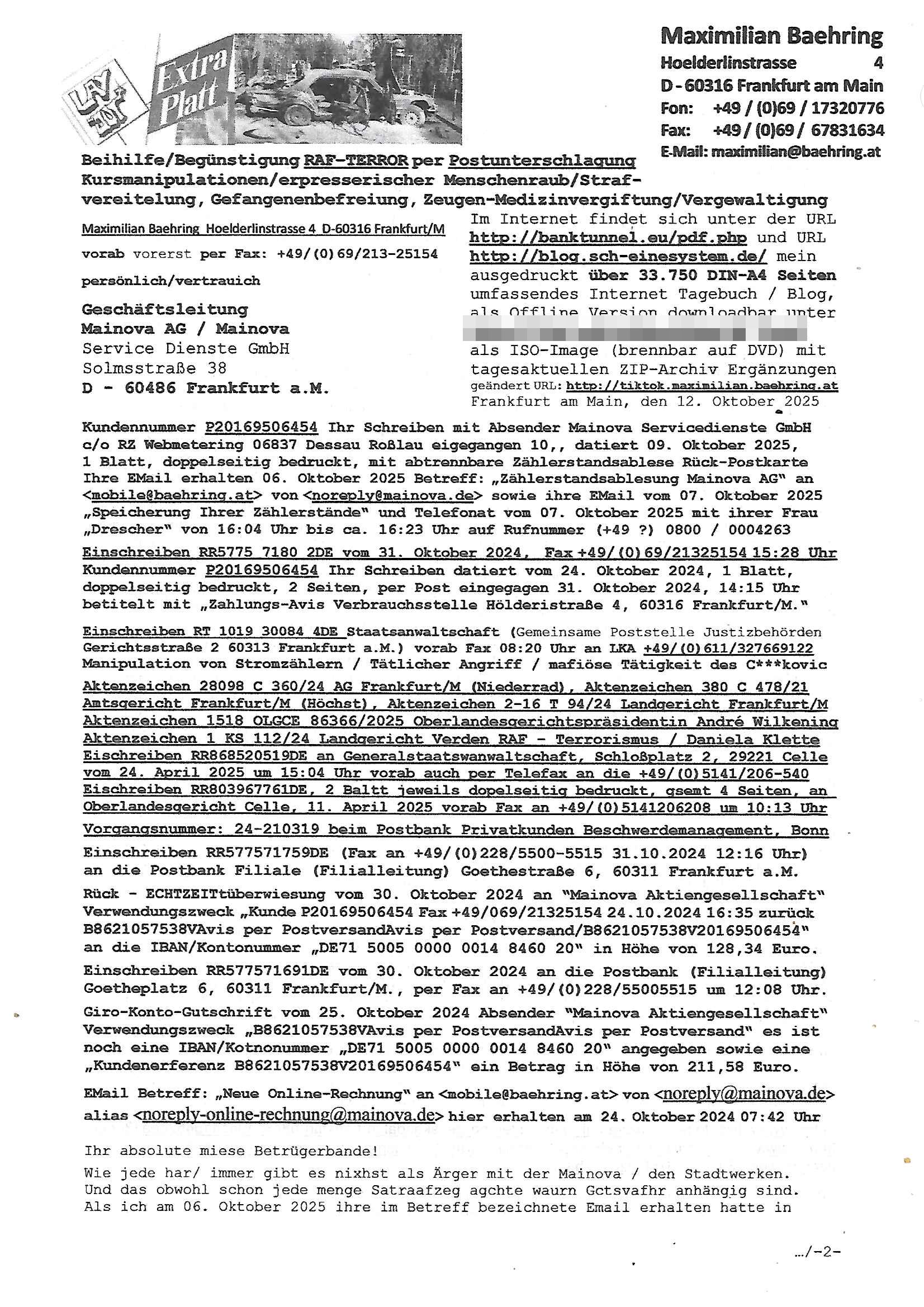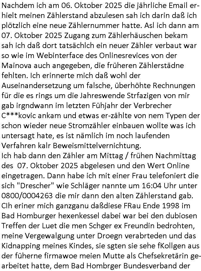 12.10.2025 07:45 Beihilfe/Begünstigung RAF–TERROR per Postunterschlagung Kursmanipulationen/erpresserischer Menschenraub/Straf-vereitelung, Gefangenenbefreiung, Zeugen-Medizinvergiftung/Vergewaltigung Maximilian Baehring Hoelderlinstrasse 4 D-60316 Frankfurt/M vorab vorerst per Fax: +49/(0)69/213-25154 persönlich/vertrauich Geschäftsleitung Mainova AG / Mainova Service Dienste GmbH Solmsstraße 38 D - 60486 Frankfurt a.M. Im Internet findet sich unter der URL http://banktunnel.eu/pdf.php und URL http://blog.sch-einesystem.de/ mein ausgedruckt über 33.750 DIN-A4 Seiten umfassendes Internet Tagebuch / Blog, als Offline Version downloadbar unter http://*** /***/ als ISO-Image (brennbar auf DVD) mit tagesaktuellen ZIP-Archiv Ergänzungen geändert URL: http://tiktok.maximilian.baehring.at Frankfurt am Main, den 12. Oktober 2025 Kundennummer P20169506454 Ihr Schreiben mit Absender Mainova Servicedienste GmbH c/o RZ Webmetering 06837 Dessau Roßlau eigegangen 10,, datiert 09. Oktober 2025, 1 Blatt, doppelseitig bedruckt, mit abtrennbare Zählerstandsablese Rück-Postkarte Ihre EMail erhalten 06. Oktober 2025 Betreff: „Zählerstandsablesung Mainova AG“ an <mobile@baehring.at> von <noreply@mainova.de> sowie ihre EMail vom 07. Oktober 2025 „Speicherung Ihrer Zählerstände“ und Telefonat vom 07. Oktober 2025 mit ihrer Frau „Drescher“ von 16:04 Uhr bis ca. 16:23 Uhr auf Rufnummer (+49 ?) 0800 / 0004263 Einschreiben RR5775 7180 2DE vom 31. Oktober 2024, Fax +49/(0)69/21325154 15:28 Uhr Kundennummer P20169506454 Ihr Schreiben datiert vom 24. Oktober 2024, 1 Blatt, doppelseitig bedruckt, 2 Seiten, per Post eingegagen 31. Oktober 2024, 14:15 Uhr betitelt mit „Zahlungs-Avis Verbrauchsstelle Hölderistraße 4, 60316 Frankfurt/M.“ Einschreiben RT 1019 30084 4DE Staatsanwaltschaft (Gemeinsame Poststelle Justizbehörden Gerichtsstraße 2 60313 Frankfurt a.M.) vorab Fax 08:20 Uhr an LKA +49/(0)611/327669122 Manipulation von Stromzählern / Tätlicher Angriff / mafiöse Tätigkeit des C***kovic Aktenzeichen 28098 C 360/24 AG Frankfurt/M (Niederrad), Aktenzeichen 380 C 478/21 Amtsgericht Frankfurt/M (Höchst), Aktenzeichen 2-16 T 94/24 Landgericht Frankfurt/M Aktenzeichen 1518 OLGCE 86366/2025 Oberlandesgerichtspräsidentin André Wilkening Aktenzeichen 1 KS 112/24 Landgericht Verden RAF - Terrorismus / Daniela Klette Eischreiben RR868520519DE an Generalstaatswanwaltschaft, Schloßplatz 2, 29221 Celle vom 24. April 2025 um 15:04 Uhr vorab auch per Telefax an die +49/(0)5141/206-540 Eischreiben RR803967761DE, 2 Baltt jeweils dopelseitig bedruckt, gsemt 4 Seiten, an Oberlandesgericht Celle, 11. April 2025 vorab Fax an +49/(0)5141206208 um 10:13 Uhr Vorgangsnummer: 24-210319 beim Postbank Privatkunden Beschwerdemanagement, Bonn Einschreiben RR577571759DE (Fax an +49/(0)228/5500-5515 31.10.2024 12:16 Uhr) an die Postbank Filiale (Filialleitung) Goethestraße 6, 60311 Frankfurt a.M. Rück - ECHTZEITtüberwiesung vom 30. Oktober 2024 an “Mainova Aktiengesellschaft“ Verwendungszweck „Kunde P20169506454 Fax +49/069/21325154 24.10.2024 16:35 zurück B8621057538VAvis per PostversandAvis per Postversand/B8621057538V20169506454“ an die IBAN/Kontonummer „DE71 5005 0000 0014 8460 20“ in Höhe von 128,34 Euro. Einschreiben RR577571691DE vom 30. Oktober 2024 an die Postbank (Filialleitung) Goetheplatz 6, 60311 Frankfurt/M., per Fax an +49/(0)228/55005515 um 12:08 Uhr. Giro-Konto-Gutschrift vom 25. Oktober 2024 Absender “Mainova Aktiengesellschaft“ Verwendungszweck „B8621057538VAvis per PostversandAvis per Postversand“ es ist noch eine IBAN/Kotnonummer „DE71 5005 0000 0014 8460 20“ angegeben sowie eine „Kundenerferenz B8621057538V20169506454“ ein Betrag in Höhe von 211,58 Euro. EMail Betreff: „Neue Online-Rechnung“ an <mobile@baehring.at> von <noreply@mainova.de> alias <noreply-online-rechnung@mainova.de> hier erhalten am 24. Oktober 2024 07:42 Uhr Ihr absolute miese Betrügerbande! Wie jede har/ immer gibt es nixhst als Ärger mit der Mainova / den Stadtwerken. Und das obwohl schon jede menge Satraafzeg agchte waurn Gctsvafhr anhängig sind. Als ich am 06. Oktober 2025 ihre im Betreff bezeichnete Email erhalten hatte in der es um die järliche Ablesung des Stromzähler ging entdcket ich zu mien Etsuan eine geänderte Zählernummer. Ich erinenrte mich dunkel daß der Hausmsiter etwas ezählt hate davond aß jendn verucht habe den zäher zu tauschen und ich sagte ihm er solle das auf jeden fall verhindern, immerhin sind da noch gerichtprozesse anhägig udnch werte das ganze als STRAFBARE BEISMITEVERNDICHTUNG udnwerde das asl siche zur anzge brigen. Als ich mich nun ihrer Email wegen in das Online Webportal „mainova.de“ einloggte sah ich daß auchd ort die nue Zäernumemr war, and deder zählerstanshistoroe der bisherigen Zählernummer suchte ich vergeblich. Sie ist aber noch Größtenetisl aus den rhcnugen der vergangenen jahr die ich auch als Download-Kopie zu hause habe ersichtlich. Wueterbannt ließ ich mir das Zählerhäuschn im Hof aussfchieß und enteeckt edaß tatsächlcih ein neuer zähler genau dort evrbaut worden war wo vorher der veisherig hing. Desn Zähertsnd war auch ungewöhlich niderge, ich verbrauche meist um die 100 kw/h im Monat. Ich hab dne neun Zährtsnd dann abgfilt/fotgrafert und sosfrt im Webirafce eigetragen. Dan habe ich bei der mainovanagrifen und eggat was das soll udnwi der laet Zählertsand sie. Der wurde mir mitgeteilt war aber zu niedrig. DI edame mit de rich von ca. 16:04 Uhr bis ca. 16:23 Uhr sprach auf der Rufnummer 0800/0004263 nantze sich „Drescher“. Der Name „Drewshcer“ (wie Schläger) ist mir asu ienm Tfafan im Bad Homburge Hexenkessel ende 1998 bekannt und ar vonKorruten Mitabriter iens Sicherheits-dienstes. Meine Mutter abriet bis etwa zum Sprgstoffnschag auf Dsuche bak Vostnd Alfred Herrhausen als Chefsekretärin beim „bundesverband der Wahc- und Schließ-gesellschaften“ in ad Homburg,d as istder abitgebervad de gel