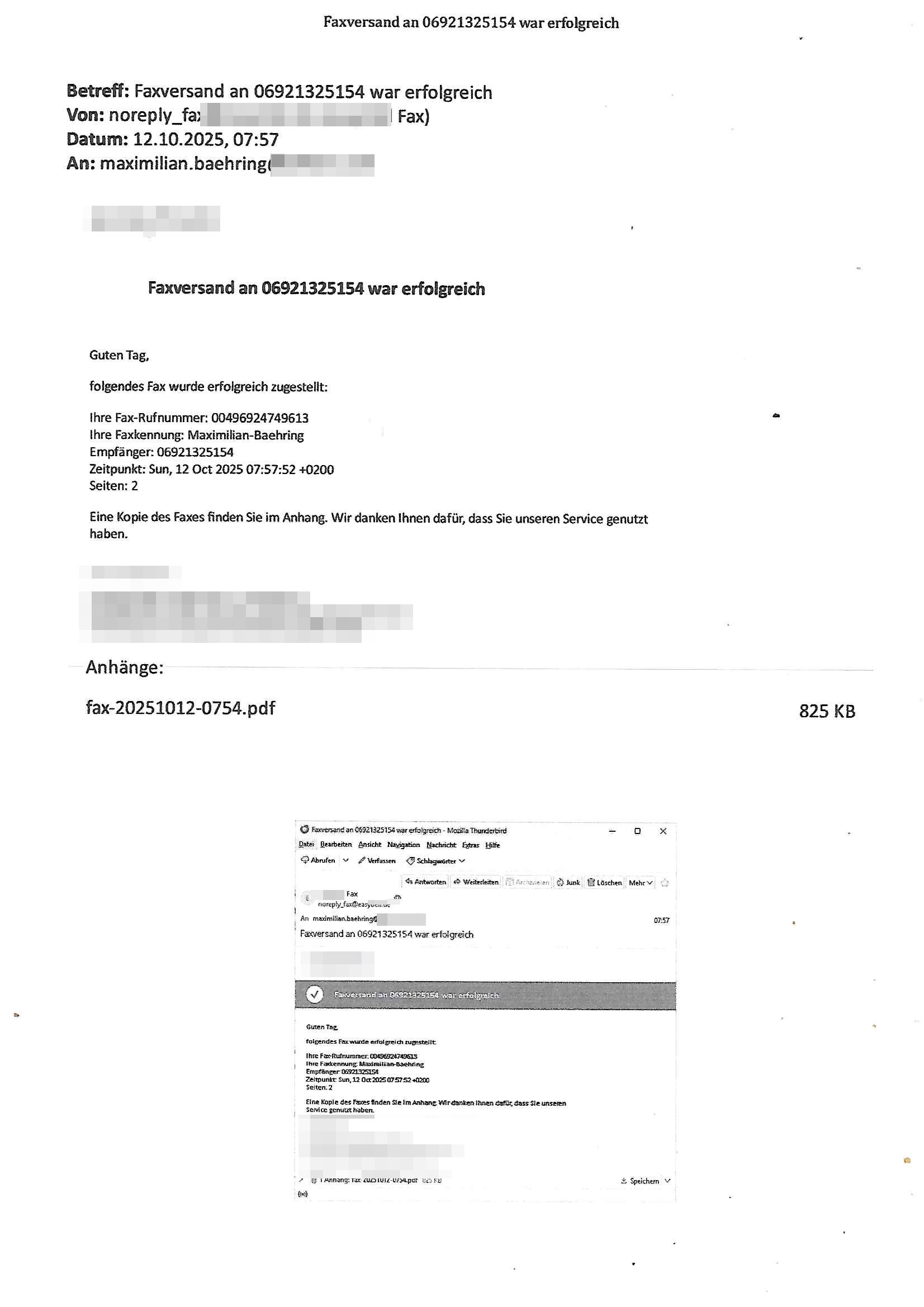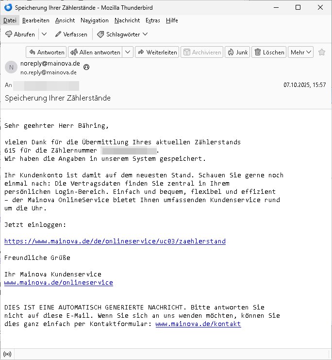12.10.2025 03:31 -------- Nachricht -------- Betreff: Zählerstandsablesung Mainova AG Datum: Mon, 6 Oct 2025 11:23:55 +0200 Von: noreply@mainova.de <no.reply@mainova.de> An: *** Sehr geehrter Herr Bähring, mit Ihrem Mainova-Vertrag haben Sie sich für die einfache Online-Übermittlung Ihres Zählerstands entschieden. Bitte erfassen Sie den Zählerstand für die Zählernummer(n) Strom - Zählernummer: 1DZG0062482338 (Marktlokations-ID: 50667855934) für die Lieferadresse Hölderlinstr. 4 Zusatzinformation: 6.OG re. bis zum 19.10.2025 in Ihrem persönlichen Mainova OnlineService. Einfach und bequem, rund um die Uhr. Über den nachfolgenden Link können Sie sich direkt mit Ihren Zugangsdaten anmelden: https://www.mainova.de/de/onlineservice/uc03/zaehlerstand Alternativ können Sie uns Ihren Zählerstand einfach unter www.mainova.de/zaehlerstand-melden mitteilen. Ganz ohne Login. Bitte halten Sie dafür Ihre Kundennummer bereit. Sollten wir bis zum oben genannten Termin keinen Zählerstand von Ihnen erhalten haben, werden wir Ihren Verbrauch anhand der Vorjahresdaten rechnerisch ermitteln. Freundliche Grüße Ihr Mainova Kundenservice www.mainova.de/onlineservice DIES IST EINE AUTOMATISCH GENERIERTE NACHRICHT. Bitte antworten Sie nicht auf diese E-Mail. Wenn Sie sich an uns wenden möchten, können Sie dies ganz einfach per Kontaktformular: www.mainova.de/kontakt -------- Nachricht -------- Betreff: Speicherung Ihrer Zählerstände Datum: Tue, 7 Oct 2025 15:57:23 +0200 Von: noreply@mainova.de <no.reply@mainova.de> An: *** Sehr geehrter Herr Bähring, vielen Dank für die Übermittlung Ihres aktuellen Zählerstands 615 für die Zählernummer ***. Wir haben die Angaben in unserem System gespeichert. Ihr Kundenkonto ist damit auf dem neuesten Stand. Schauen Sie gerne noch einmal nach: Die Vertragsdaten finden Sie zentral in Ihrem persönlichen Login-Bereich. Einfach und bequem, flexibel und effizient – der Mainova OnlineService bietet Ihnen umfassenden Kundenservice rund um die Uhr. Jetzt einloggen: https://www.mainova.de/de/onlineservice/uc03/zaehlerstand Freundliche Grüße Ihr Mainova Kundenservice www.mainova.de/onlineservice DIES IST EINE AUTOMATISCH GENERIERTE NACHRICHT. Bitte antworten Sie nicht auf diese E-Mail. Wenn Sie sich an uns wenden möchten, können Sie dies ganz einfach per Kontaktformular: www.mainova.de/kontakt === Anrufe Datum Name / Rufnummer *** Eigene Rufnummer Dauer (hh:mm) 07.10.25 16:04 08000004263 *** 6967831634 0:19 07.10.25 15:26 06980088012 *** 6967831634 0:04 === Zeitraum 07.10.2025 16:04:34 Dauer 18:43 Eigene Rufnummer 06967831634 Status Ausgehende Gesprächspartner 08000004263 Typ Anruf Zeitraum Zeitraum 07.10.2025 15:26:03 Dauer 03:12 Eigene Rufnummer 06967831634 Status Ausgehende Gesprächspartner 06980088012 Typ [0] "202510120331-0-1.jpg" [1] "202510120331-0-2.jpg" [2] "202510120331-0-3.jpg" [3] "202510120331-0-4.jpg" [4] "202510120331-0-5.jpg" [5] "202510120331-0-6.jpg" [6] "202510120331-0-7.jpg" |