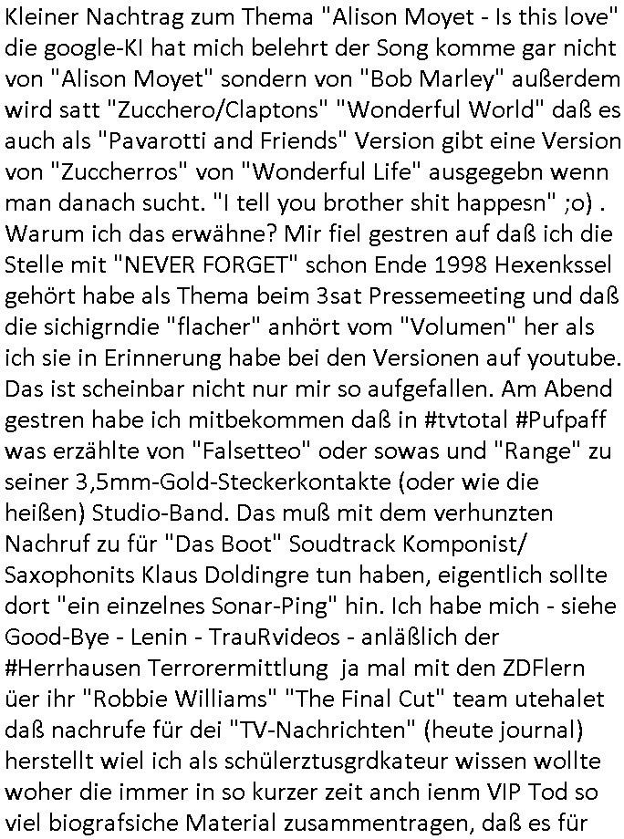 Kleiner Nachtrag zum Thema "Alison Moyet - Is this love" die google-KI hat mich belehrt der Song komme gar nicht von "Alison Moyet" sondern von "Bob Marley" außerdem wird satt "Zucchero/Claptons" "Wonderful World" daß es auch als "Pavarotti and Friends" Version gibt eine Version von "Zuccherros" von "Wonderful Life" ausgegebn wenn man danach sucht. "I tell you brother shit happesn" ;o) . Warum ich das erwähne? Mir fiel gestren auf daß ich die Stelle mit "NEVER FORGET" schon Ende 1998 Hexenkssel gehört habe als Thema beim 3sat Pressemeeting und daß die sichigrndie "flacher" anhört vom "Volumen" her als ich sie in Erinnerung habe bei den Versionen auf youtube. Das ist scheinbar nicht nur mir so aufgefallen. Am Abend gestren habe ich mitbekommen daß in #tvtotal #Pufpaff was erzählte von "Falsetteo" oder sowas und "Range" zu seiner 3,5mm-Gold-Steckerkontakte (oder wie die heißen) Studio-Band. Das muß mit dem verhunzten Nachruf zu für "Das Boot" Soudtrack Komponist/ Saxophonits Klaus Doldingre tun haben, eigentlich sollte dort "ein einzelnes Sonar-Ping" hin. Ich habe mich - siehe Good-Bye - Lenin - TrauRvideos - anläßlich der #Herrhausen Terrorermittlung ja mal mit den ZDFlern üer ihr "Robbie Williams" "The Final Cut" team utehalet daß nachrufe für dei "TV-Nachrichten" (heute journal) herstellt wiel ich als schülerztusgrdkateur wissen wollte woher die immer in so kurzer zeit anch ienm VIP Tod so viel biografsiche Material zusammentragen, daß es für