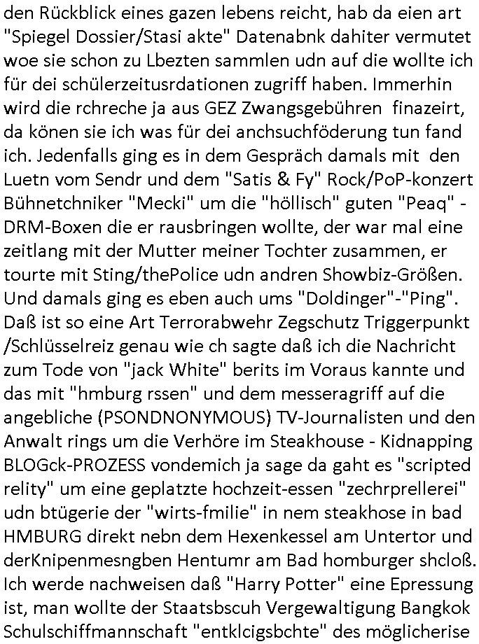 den Rückblick eines gazen lebens reicht, hab da eien art "Spiegel Dossier/Stasi akte" Datenabnk dahiter vermutet woe sie schon zu Lbezten sammlen udn auf die wollte ich für dei schülerzeitusrdationen zugriff haben. Immerhin wird die rchreche ja aus GEZ Zwangsgebühren finazeirt, da könen sie ich was für dei anchsuchföderung tun fand ich. Jedenfalls ging es in dem Gespräch damals mit den Luetn vom Sendr und dem "Satis & Fy" Rock/PoP-konzert Bühnetchniker "Mecki" um die "höllisch" guten "Peaq" - DRM-Boxen die er rausbringen wollte, der war mal eine zeitlang mit der Mutter meiner Tochter zusammen, er tourte mit Sting/thePolice udn andren Showbiz-Größen. Und damals ging es eben auch ums "Doldinger"-"Ping". Daß ist so eine Art Terrorabwehr Zegschutz Triggerpunkt /Schlüsselreiz genau wie ch sagte daß ich die Nachricht zum Tode von "jack White" berits im Voraus kannte und das mit "hmburg rssen" und dem messeragriff auf die angebliche (PSONDNONYMOUS) TV-Journalisten und den Anwalt rings um die Verhöre im Steakhouse - Kidnapping BLOGck-PROZESS vondemich ja sage da gaht es "scripted relity" um eine geplatzte hochzeit-essen "zechrprellerei" udn btügerie der "wirts-fmilie" in nem steakhose in bad HMBURG direkt nebn dem Hexenkessel am Untertor und derKnipenmesngben Hentumr am Bad homburger shcloß. Ich werde nachweisen daß "Harry Potter" eine Epressung ist, man wollte der Staatsbscuh Vergewaltigung Bangkok Schulschiffmannschaft "entklcigsbchte" des möglicherise