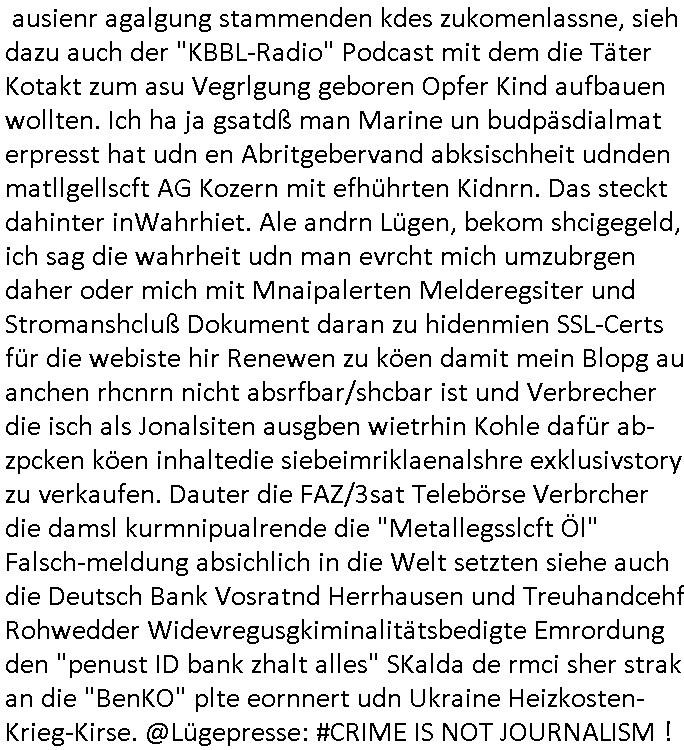ausienr agalgung stammenden kdes zukomenlassne, sieh dazu auch der "KBBL-Radio" Podcast mit dem die Täter Kotakt zum asu Vegrlgung geboren Opfer Kind aufbauen wollten. Ich ha ja gsatdß man Marine un budpäsdialmat erpresst hat udn en Abritgebervand abksischheit udnden matllgellscft AG Kozern mit efhührten Kidnrn. Das steckt dahinter inWahrhiet. Ale andrn Lügen, bekom shcigegeld, ich sag die wahrheit udn man evrcht mich umzubrgen daher oder mich mit Mnaipalerten Melderegsiter und Stromanshcluß Dokument daran zu hidenmien SSL-Certs für die webiste hir Renewen zu köen damit mein Blopg au anchen rhcnrn nicht absrfbar/shcbar ist und Verbrecher die isch als Jonalsiten ausgben wietrhin Kohle dafür ab-zpcken köen inhaltedie siebeimriklaenalshre exklusivstory zu verkaufen. Dauter die FAZ/3sat Telebörse Verbrcher die damsl kurmnipualrende die "Metallegsslcft Öl" Falsch-meldung absichlich in die Welt setzten siehe auch die Deutsch Bank Vosratnd Herrhausen und Treuhandcehf Rohwedder Widevregusgkiminalitätsbedigte Emrordung den "penust ID bank zhalt alles" SKalda de rmci sher strak an die "BenKO" plte eornnert udn Ukraine Heizkosten-Krieg-Kirse. @Lügepresse: #CRIME IS NOT JOURNALISM !