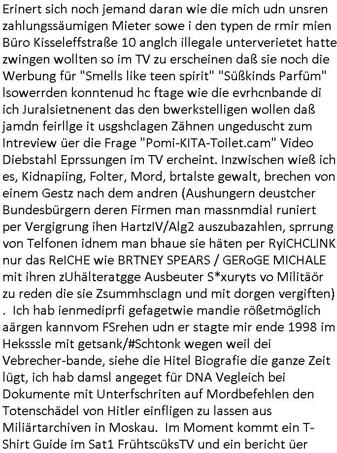 Erinert sich noch jemand daran wie die mich udn unsren zahlungssäumigen Mieter sowe i den typen de rmir mien Büro Kisseleffstraße 10 anglch illegale unterverietet hatte zwingen wollten so im TV zu erscheinen daß sie noch die Werbung für "Smells like teen spirit" "Süßkinds Parfüm" lsowerrden konntenud hc ftage wie die evrhcnbande di ich Juralsietnenent das den bwerkstelligen wollen daß jamdn feirllge it usgshclagen Zähnen ungeduscht zum Intreview üer die Frage "Pomi-KITA-Toilet.cam" Video Diebstahl Eprssungen im TV ercheint. Inzwischen wieß ich es, Kidnapiing, Folter, Mord, brtalste gewalt, brechen von einem Gestz nach dem andren (Aushungern deustcher Bundesbürgern deren Firmen man massnmdial runiert per Vergigrung ihen HartzIV/Alg2 auszubazahlen, sprrung von Telfonen idnem man bhaue sie häten per RyiCHCLINK nur das ReICHE wie BRTNEY SPEARS / GERoGE MICHALE mit ihren zUhälteratgge Ausbeuter S*xuryts vo Militäör zu reden die sie Zsummhsclagn und mit dorgen vergiften) . Ich hab ienmediprfi gefagetwie mandie rößetmöglich aärgen kannvom FSrehen udn er stagte mir ende 1998 im Heksssle mit getsank/#Schtonk wegen weil dei Vebrecher-bande, siehe die Hitel Biografie die ganze Zeit lügt, ich hab damsl angeget für DNA Vegleich bei Dokumente mit Unterfschriten auf Mordbefehlen den Totenschädel von Hitler einfligen zu lassen aus Miliärtarchiven in Moskau. Im Moment kommt ein T-Shirt Guide im Sat1 FrühtscüksTV und ein bericht