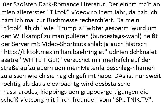 üer Sadisten Dark-Romance Literatur. Der einnrt mcih an mien allererstes "Tiktok" videov ro inem Jahr, da hab ich nämlich mal zur Buchmesse recherchiert. Da mein "tiktok" ählch" wie "Trump"s Twitter gesperrt wurd um den WHlkampf zu manipulieren (bundestags-wahl) heißt der Server mit Video-Shortcuts shlab ja auch histrsch "http://tiktok.maximilian.baehring.at" udnien dchknalet asatre "WHITE TIGER" versuchct mir merhafch auf der straße aufzulauern udn meinMaterila beschlag-nhamen zu alssen wielch sie naglch gefilmt habe. DAs ist nur sweit rochtig als das sie evröächtg wird desbstalsche massnarodes, kidppings udn gruppevrgeltigungen die scheiß vietcong mit ihren freunden vom "SPUTNIK.TV".