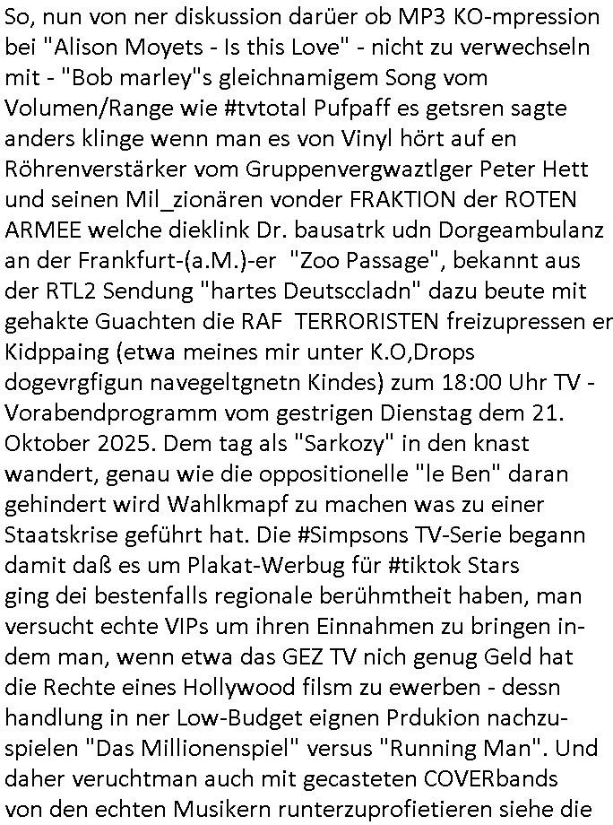 So, nun von ner diskussion darüer ob MP3 KO-mpression bei "Alison Moyets - Is this Love" - nicht zu verwechseln mit - "Bob marley"s gleichnamigem Song vom Volumen/Range wie #tvtotal Pufpaff es getsren sagte anders klinge wenn man es von Vinyl hört auf en Röhrenverstärker vom Gruppenvergwaztlger Peter Hett und seinen Mil_zionären vonder FRAKTION der ROTEN ARMEE welche dieklink Dr. bausatrk udn Dorgeambulanz an der Frankfurt-(a.M.)-er "Zoo Passage", bekannt aus der RTL2 Sendung "hartes Deutsccladn" dazu beute mit gehakte Guachten die RAF TERRORISTEN freizupressen er Kidppaing (etwa meines mir unter K.O,Drops dogevrgfigun navegeltgnetn Kindes) zum 18:00 Uhr TV - Vorabendprogramm vom gestrigen Dienstag dem 21. Oktober 2025. Dem tag als "Sarkozy" in den knast wandert, genau wie die oppositionelle "le Ben" daran gehindert wird Wahlkmapf zu machen was zu einer Staatskrise geführt hat. Die #Simpsons TV-Serie begann damit daß es um Plakat-Werbug für #tiktok Stars ging dei bestenfalls regionale berühmtheit haben, man versucht echte VIPs um ihren Einnahmen zu bringen in-dem man, wenn etwa das GEZ TV nich genug Geld hat die Rechte eines Hollywood filsm zu ewerben - dessn handlung in ner Low-Budget eignen Prdukion nachzu- spielen "Das Millionenspiel" versus "Running Man". Und daher veruchtman auch mit gecasteten COVERbands von den echten Musikern runterzuprofietieren siehe die