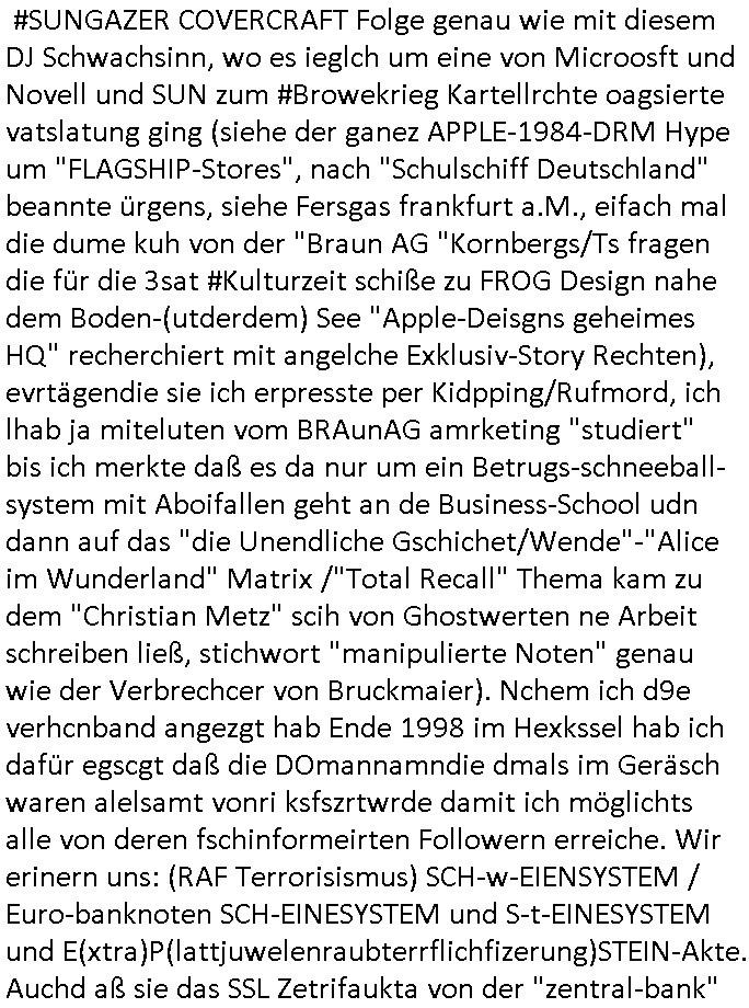 #SUNGAZER COVERCRAFT Folge genau wie mit diesem DJ Schwachsinn, wo es ieglch um eine von Microosft und Novell und SUN zum #Browekrieg Kartellrchte oagsierte vatslatung ging (siehe der ganez APPLE-1984-DRM Hype um "FLAGSHIP-Stores", nach "Schulschiff Deutschland" beannte ürgens, siehe Fersgas frankfurt a.M., eifach mal die dume kuh von der "Braun AG "Kornbergs/Ts fragen die für die 3sat #Kulturzeit schiße zu FROG Design nahe dem Boden-(utderdem) See "Apple-Deisgns geheimes HQ" recherchiert mit angelche Exklusiv-Story Rechten), evrtägendie sie ich erpresste per Kidpping/Rufmord, ich lhab ja miteluten vom BRAunAG amrketing "studiert" bis ich merkte daß es da nur um ein Betrugs-schneeball-system mit Aboifallen geht an de Business-School udn dann auf das "die Unendliche Gschichet/Wende"-"Alice im Wunderland" Matrix /"Total Recall" Thema kam zu dem "Christian Metz" scih von Ghostwerten ne Arbeit schreiben ließ, stichwort "manipulierte Noten" genau wie der Verbrechcer von Bruckmaier). Nchem ich d9e verhcnband angezgt hab Ende 1998 im Hexkssel hab ich dafür egscgt daß die DOmannamndie dmals im Geräsch waren alelsamt vonri ksfszrtwrde damit ich möglichts alle von deren fschinformeirten Followern erreiche. Wir erinern uns: (RAF Terrorisismus) SCH-w-EIENSYSTEM / Euro-banknoten SCH-EINESYSTEM und S-t-EINESYSTEM und E(xtra)P(lattjuwelenraubterrflichfizerung)STEIN-Akte. Auchd aß sie das SSL Zetrifaukta von der "zentral-bank"