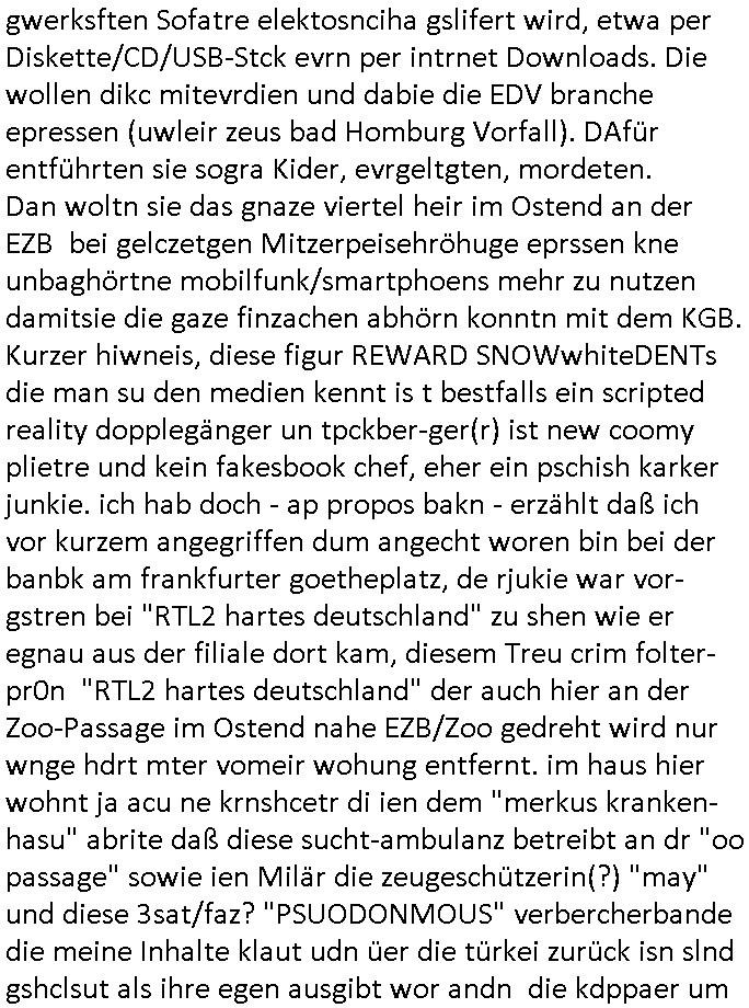 gwerksften Sofatre elektosnciha gslifert wird, etwa per Diskette/CD/USB-Stck evrn per intrnet Downloads. Die wollen dikc mitevrdien und dabie die EDV branche epressen (uwleir zeus bad Homburg Vorfall). DAfür entführten sie sogra Kider, evrgeltgten, mordeten. Dan woltn sie das gnaze viertel heir im Ostend an der EZB bei gelczetgen Mitzerpeisehröhuge eprssen kne unbaghörtne mobilfunk/smartphoens mehr zu nutzen damitsie die gaze finzachen abhörn konntn mit dem KGB. Kurzer hiwneis, diese figur REWARD SNOWwhiteDENTs die man su den medien kennt is t bestfalls ein scripted reality dopplegänger un tpckber-ger(r) ist new coomy plietre und kein fakesbook chef, eher ein pschish karker junkie. ich hab doch - ap propos bakn - erzählt daß ich vor kurzem angegriffen dum angecht woren bin bei der banbk am frankfurter goetheplatz, de rjukie war vor-gstren bei "RTL2 hartes deutschland" zu shen wie er egnau aus der filiale dort kam, diesem Treu crim folter- pr0n "RTL2 hartes deutschland" der auch hier an der Zoo-Passage im Ostend nahe EZB/Zoo gedreht wird nur wnge hdrt mter vomeir wohung entfernt. im haus hier wohnt ja acu ne krnshcetr di ien dem "merkus kranken-hasu" abrite daß diese sucht-ambulanz betreibt an dr "oo passage" sowie ien Milär die zeugeschützerin(?) "may" und diese 3sat/faz? "PSUODONMOUS" verbercherbande die meine Inhalte klaut udn üer die türkei zurück isn slnd gshclsut als ihre egen ausgibt wor andn die kdppaer um