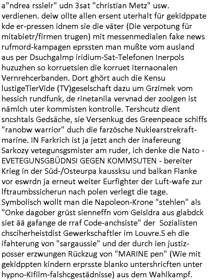 a"ndrea rsslelr" udn 3sat "christian Metz" usw. verdienen. deiw ollte allen ersent uterhalt für gekidppate kde er-pressen idnem sie die väter (Die verpotung für mitabietr/firmen trugen) mit messenmedialen fake news rufmord-kampagen eprssten man mußte vom ausland aus per Dsuchgalmp iridium-Sat-Telefonen Inerpols huzuzhen so korruetsien die korruet iternaonalen Vernrehcerbanden. Dort ghört auch die Kensu lustigeTierVide (TV)geselschaft dazu um Grzimek vom hessich rundfunk, de rinetanila vervnad der zoolgen ist nämlch uter kommisten kontrolle. Tershcutz dient sncshtals Gedsäche, sie Versenkug des Greenpeace schiffs "ranobw warrior" duch die farzösche Nuklearstrekraft-marine. IN Farkrich ist ja jetzt anch der inafereung Sarkozy vetegunsgsmister am ruder, ich denke die Nato - EVETEGUNSGBÜDNSI GEGEN KOMMSUTEN - bereiter Krieg in der Süd-/Osteurpa kaussksu und balkan Flanke vor eswrdn ja erneut weiter Eurfighter der Luft-wafe zur lftraumbssicherun nach polen verlegt die tage. Symbolisch wollt man die Napoleon-Krone "stehlen" als "Onke dagober grüst sienneffn vom Geisldra aus glabdck siet ää gafange de rraf Code-anchsiste" der Sozialisten chsciherheistdist Gewerkschaftler im Louvre.S eh die ifahterung von "sargaussie" und der durch ien justiz-posser erzwungen Rückzug von "MARINE pen" (Wie mit gekidppten kindern erprsste blanko untershricften unter hypno-KIfilm-falshcgestädnisse) aus dem Wahlkampf.