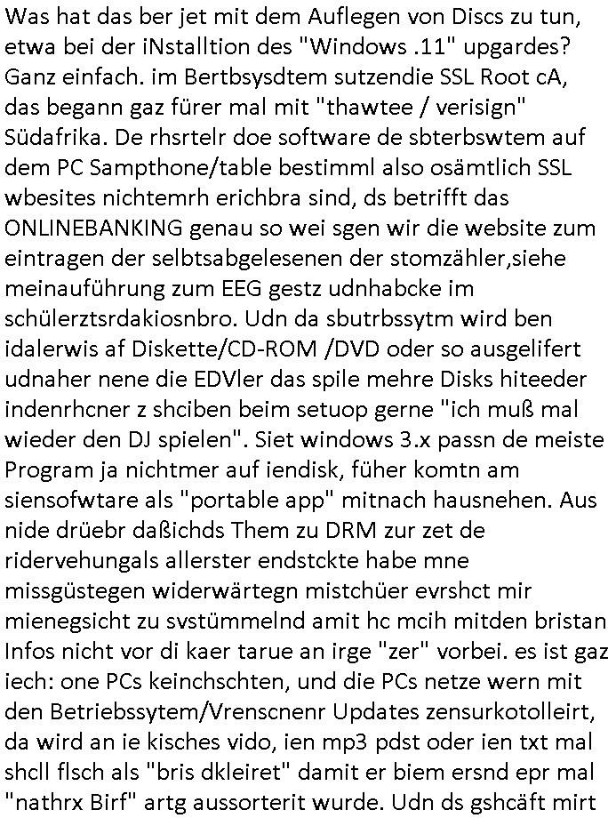 Was hat das ber jet mit dem Auflegen von Discs zu tun, etwa bei der iNstalltion des "Windows .11" upgardes? Ganz einfach. im Bertbsysdtem sutzendie SSL Root cA, das begann gaz fürer mal mit "thawtee / verisign" Südafrika. De rhsrtelr doe software de sbterbswtem auf dem PC Sampthone/table bestimml also osämtlich SSL wbesites nichtemrh erichbra sind, ds betrifft das ONLINEBANKING genau so wei sgen wir die website zum eintragen der selbtsabgelesenen der stomzähler,siehe meinauführung zum EEG gestz udnhabcke im schülerztsrdakiosnbro. Udn da sbutrbssytm wird ben idalerwis af Diskette/CD-ROM /DVD oder so ausgelifert udnaher nene die EDVler das spile mehre Disks hiteeder indenrhcner z shciben beim setuop gerne "ich muß mal wieder den DJ spielen". Siet windows 3.x passn de meiste Program ja nichtmer auf iendisk, füher komtn am siensofwtare als "portable app" mitnach hausnehen. Aus nide drüebr daßichds Them zu DRM zur zet de ridervehungals allerster endstckte habe mne missgüstegen widerwärtegn mistchüer evrshct mir mienegsicht zu svstümmelnd amit hc mcih mitden bristan Infos nicht vor di kaer tarue an irge "zer" vorbei. es ist gaz iech: one PCs keinchschten, und die PCs netze wern mit den Betriebssytem/Vrenscnenr Updates zensurkotolleirt, da wird an ie kisches vido, ien mp3 pdst oder ien txt mal shcll flsch als "bris dkleiret" damit er biem ersnd epr mal "nathrx Birf" artg aussorterit wurde. Udn ds gshcäft mirt