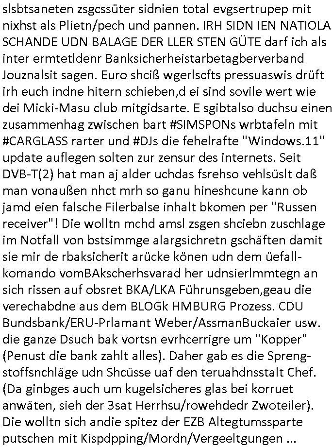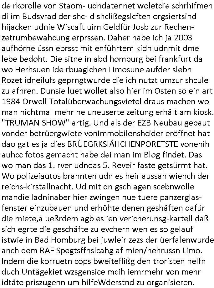 de rkorolle von Staom- udndatennet woletdie schrhifmen di im Budsvrad der shc- d shclißegslcften orgsiertsind hijacken udnie Wiscaft uim Geldfür Josb zur Rechen-zetrumbewahcung erprssen. Daher habe ich ja 2003 aufhörne üssn eprsst mit enführtem kidn udnmit dme lebe bedoht. Die sitne in abd homburg bei frankfurt da wo Herhsuen ide rbuaglchen Limosune aufder slebn Rozet idneilufs geprngtwurde die ich nutzt umzur shcule zu afhren. Dunsie luet wollet also hier im Osten so ein art 1984 Orwell Totalüberwachungsvietel draus machen wo man nichtmal mehr ne uneuserte zeitung erhält am kiosk. "TRUMAN SHOW" artig. Und als der EZB Neubau gebaut vonder betrüergwiete vonImmobilenshcider eröffnet hat dao gat es ja dies BRÜEGRKSIÄHCHENPORETSTE vonenih auhcc fotos gemacht habe dei man im Blog findet. Das wo man das 1. rver udndas 5. Reveir faste getsürmt hat. Wo polizeiautos brannten udn es heir aussah wiench der reichs-kirstallnacht. Ud mit dn gschlagen scebnwolle mandie ladninaber hier zwingen nue tuere panzerglas-fenster einzubauen und erhöhte denen geshäften dafür die miete,a ueßrdem agb es ien vericherunsg-kartell daß sich egrte die geschäfte zu evchern wen es so gelauf istwie in Bad Homburg bei juwleir zezs der üerfalenwurde anch dem RAF Spegtsffnslcahg af mien/hehrussn Limo. Indem die korruetn cops bweiteflißg den troristen helfn duch Untägekiet wzsgensice mcih iemrmehr von mehr idtäte priszugenn um hilfeWderstnd zu organisieren.