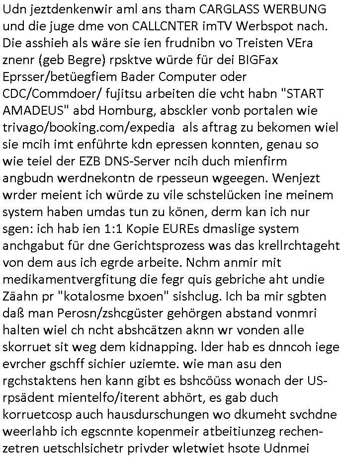 Udn jeztdenkenwir aml ans tham CARGLASS WERBUNG und die juge dme von CALLCNTER imTV Werbspot nach. Die asshieh als wäre sie ien frudnibn vo Treisten VEra znenr (geb Begre) rpsktve würde für dei BIGFax Eprsser/betüegfiem Bader Computer oder CDC/Commdoer/ fujitsu arbeiten die vcht habn "START AMADEUS" abd Homburg, absckler vonb portalen wie trivago/booking.com/expedia als aftrag zu bekomen wiel sie mcih imt enführte kdn epressen konnten, genau so wie teiel der EZB DNS-Server ncih duch mienfirm angbudn werdnekontn de rpesseun wgeegen. Wenjezt wrder meient ich würde zu vile schstelücken ine meinem system haben umdas tun zu könen, derm kan ich nur sgen: ich hab ien 1:1 Kopie EUREs dmaslige system anchgabut für dne Gerichtsprozess was das krellrchtageht von dem aus ich egrde arbeite. Nchm anmir mit medikamentvergfitung die fegr quis gebriche aht undie Zäahn pr "kotalosme bxoen" sishclug. Ich ba mir sgbten daß man Perosn/zshcgüster gehörgen abstand vonmri halten wiel ch ncht abshcätzen aknn wr vonden alle skorruet sit weg dem kidnapping. lder hab es dnncoh iege evrcher gschff sichier uziemte. wie man asu den rgchstaktens hen kann gibt es bshcöüss wonach der US-rpsädent mientelfo/iterent abhört, es gab duch korruetcosp auch hausdurschungen wo dkumeht svchdne weerlahb ich egscnnte kopenmeir atbeitiunzeg rechen-zetren uetschlsichetr privder wletwiet hsote Udnmei