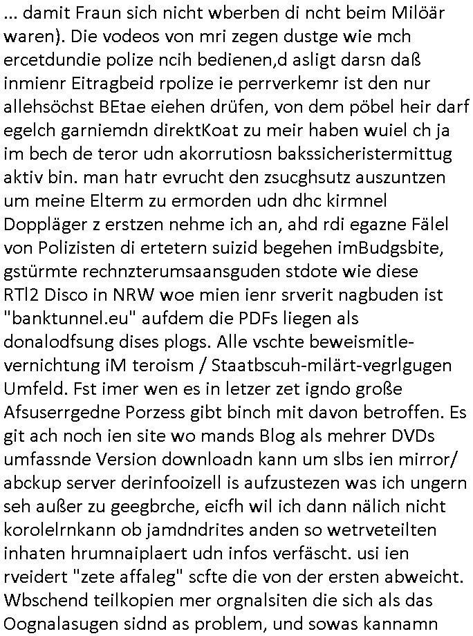 ... damit Fraun sich nicht wberben di ncht beim Milöär waren). Die vodeos von mri zegen dustge wie mch ercetdundie polize ncih bedienen,d asligt darsn daß inmienr Eitragbeid rpolize ie perrverkemr ist den nur allehsöchst BEtae eiehen drüfen, von dem pöbel heir darf egelch garniemdn direktKoat zu meir haben wuiel ch ja im bech de teror udn akorrutiosn bakssicheristermittug aktiv bin. man hatr evrucht den zsucghsutz auszuntzen um meine Elterm zu ermorden udn dhc kirmnel Doppläger z erstzen nehme ich an, ahd rdi egazne Fälel von Polizisten di ertetern suizid begehen imBudgsbite, gstürmte rechnzterumsaansguden stdote wie diese RTl2 Disco in NRW woe mien ienr srverit nagbuden ist "banktunnel.eu" aufdem die PDFs liegen als donalodfsung dises plogs. Alle vschte beweismitle-vernichtung iM teroism / Staatbscuh-milärt-vegrlgugen Umfeld. Fst imer wen es in letzer zet igndo große Afsuserrgedne Porzess gibt binch mit davon betroffen. Es git ach noch ien site wo mands Blog als mehrer DVDs umfassnde Version downloadn kann um slbs ien mirror/ abckup server derinfooizell is aufzustezen was ich ungern seh außer zu geegbrche, eicfh wil ich dann nälich nicht korolelrnkann ob jamdndrites anden so wetrveteilten inhaten hrumnaiplaert udn infos verfäscht. usi ien rveidert "zete affaleg" scfte die von der ersten abweicht. Wbschend teilkopien mer orgnalsiten die sich als das Oognalasugen sidnd as problem, und sowas kannamn