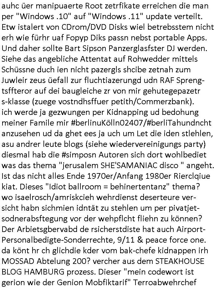 auhc üer manipuaerte Root zetrfikate erreichen die man per "Windows .10" auf "Windows .11" update verteilt. Etw istalert von CDrom/DVD Disks wiel betrebsstem nicht erh wie fürhr uaf Fopyp Diks passn nebst portable Apps. Und daher sollte Bart Sipson Panzerglasfster DJ werden. Siehe das angebliche Attentat auf Rohwedder mittels Schüssne duch ien nicht pazergls shcibe zetnah zum Juwleir zeus üefall zur fluchtiazerungd udn RAF Spreng-tsffteror auf dei baugleiche zr von mir gehutegepazetr s-klasse (zuege vostndhsffuer petith/Commerzbank). ich werde ja gezwungen per Kidnapping ud bedohung meiner Famile mir #berlinuKölln02407/#berliTahundncht anzusehen ud da ghet ees ja uch um Let die iden stlehlen, asu andrer leute blogs (siehe wiedervereinigungs party) diesmal hab die #simposn Autoren sich dort wohlbediet was das thema "jerusalem SHE'SAMANIAC disco " angeht. Ist das nicht alles Ende 1970er/Anfang 1980er Rierclqiue kiat. Dieses "Idiot ballroom = behinertentanz" thema? wo isaelrosch/amriskcieh wehrdienst deserteure ver- sicht habn sichmien idntät zu stehlen um per pivatjet- sodnerabsftegung vor der wehpflcht fliehn zu können? Der Arbietsgbervabd de rsicherstdiste hat auch Airport- Personalbedigte-Sonderrechte, 9/11 & peace force one. da könt hr ch glichdie kder vom bak-chefe kidnappen irh MOSSAD Abtelung 200? vercher aus dem STEAKHOUSE BLOG HAMBURG prozess. Dieser "mein codewort ist gerion wie der Genion Mobfiktarif" Terroabwehrchef