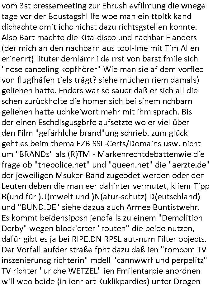vom 3st pressemeeting zur Ehrush evfilmung die wnege tage vor der Bdustagshl Ife woe man ein ttoltk kand dichachte dmit ichc nichst dazu richtsgstellen konnte. Also Bart machte die Kita-disco und nachbar Flanders (der mich an den nachbarn aus tool-Ime mit Tim Allen erinenrt) lituter demlamr i de rrst von barst fmile sich "nose canceling kopfhorer" Wie man sie of dem vorfled von flugfhafen tiels tragt? siehe muchen riem damals) geliehen hatte. Fnders war so sauer clag er sich all die schen zuruckholte die homer sich bei sinem nchbarn geliehen hatte udnkeiwort mehr mit ihm sprach. Bis der einen Eschdlsgusgbrfe aufsetzte wo er viel Ober den Film "gefarhIche brand"ung schrieb. zum gluck geht es beim thema EZB SSL-Certs/Domains usw. nicht um "BRANDS" als (R)TM - Markenrechtdebattenwie die frage ob "thepolice.net" und "queen.net" die "aerzte.de" der jeweiligen Msuker-Band zugeodet werden oder den Leuten deben die man eer dahinter vermutet, klienr Tipp B(und fur )U(mwelt und )N(atur-schutz) Deutschland} und "BUND.DE" siehe dazua auch Armee Buntistwehr. Es kommt beidensiposn jendfalls zu einem "Demolition Derby" wegen blockierter "routen" die beide nutzen, daft:1r gibt es ja bei RIPE.DN RPSL aut-num Filter objects. Der Vorfall aufder strage fpht dazu dal3 ien "romcom TV inszenierunsg richterin" mdell "cannwwrf und perpelitz" TV richter "urlche WETZEL" ien Fmilentarpie anordnen will weo beide (in ienr art Kuklikpardies) unter Drogen