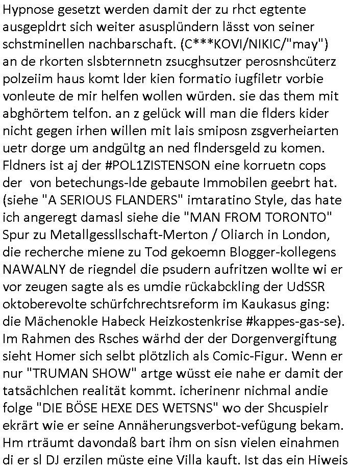 Hypnose gesetzt werden damit der zu rhct egtente ausgepldrt sich weiter asusplündern lässt von seiner schstminellen nachbarschaft. (C***KOVI/NIKIC/"may") an de rkorten slsbternnetn zsucghsutzer perosnshcüterz polzeiim haus komt lder kien formatio iugfiletr vorbie vonleute de mir helfen wollen würden. sie das them mit abghörtem telfon. an z gelück will man die flders kider nicht gegen irhen willen mit lais smiposn zsgverheiarten uetr dorge um andgültg an ned flndersgeld zu komen. Fldners ist aj der #POL1ZISTENSON eine korruetn cops der von betechungs-lde gebaute Immobilen geebrt hat. (siehe "A SERIOUS FLANDERS" imtaratino Style, das hate ich angeregt damasl siehe die "MAN FROM TORONTO" Spur zu Metallgessllschaft-Merton / Oliarch in London, die recherche miene zu Tod gekoemn Blogger-kollegens NAWALNY de riegndel die psudern aufritzen wollte wi er vor zeugen sagte als es umdie rückabckling der UdSSR oktoberevolte schürfchrechtsreform im Kaukasus ging: die Mächenokle Habeck Heizkostenkrise #kappes-gas-se). Im Rahmen des Rsches wärhd der der Dorgenvergiftung sieht Homer sich selbt plötzlich als Comic-Figur. Wenn er nur "TRUMAN SHOW" artge wüsst eie nahe er damit der tatsächlchen realität kommt. icherinenr nichmal andie folge "DIE BÖSE HEXE DES WETSNS" wo der Shcuspielr ekrärt wie er seine Annäherungsverbot-vefügung bekam. Hm rträumt davondaß bart ihm on sisn vielen einahmen di er sl DJ erzilen müste eine Villa kauft. Ist das ein Hiweis