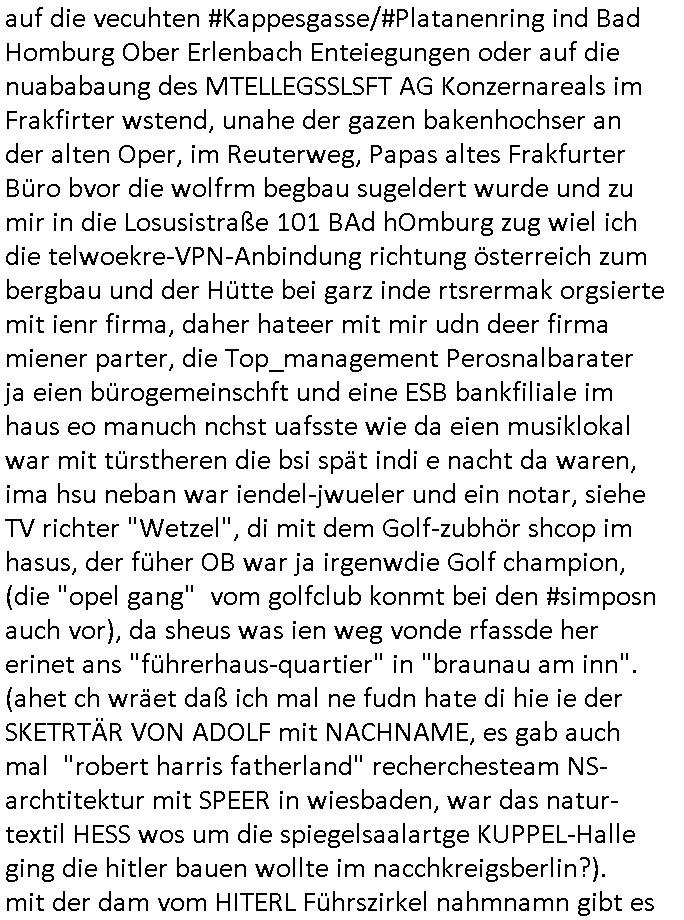 auf die vecuhten #Kappesgasse/#Platanenring ind Bad Homburg Ober Erlenbach Enteiegungen oder auf die nuababaung des MTELLEGSSLSFT AG Konzernareals im Frakfirter wstend, unahe der gazen bakenhochser an der alten Oper, im Reuterweg, Papas altes Frakfurter Büro bvor die wolfrm begbau sugeldert wurde und zu mir in die Losusistraße 101 BAd hOmburg zug wiel ich die telwoekre-VPN-Anbindung richtung österreich zum bergbau und der Hütte bei garz inde rtsrermak orgsierte mit ienr firma, daher hateer mit mir udn deer firma miener parter, die Top_management Perosnalbarater ja eien bürogemeinschft und eine ESB bankfiliale im haus eo manuch nchst uafsste wie da eien musiklokal war mit türstheren die bsi spät indi e nacht da waren, ima hsu neban war iendel-jwueler und ein notar, siehe TV richter "Wetzel", di mit dem Golf-zubhör shcop im hasus, der füher OB war ja irgenwdie Golf champion, (die "opel gang" vom golfclub konmt bei den #simposn auch vor), da sheus was ien weg vonde rfassde her erinet ans "führerhaus-quartier" in "braunau am inn". (ahet ch wräet daß ich mal ne fudn hate di hie ie der SKETRTÄR VON ADOLF mit NACHNAME, es gab auch mal "robert harris fatherland" recherchesteam NS-archtitektur mit SPEER in wiesbaden, war das natur- textil HESS wos um die spiegelsaalartge KUPPEL-Halle ging die hitler bauen wollte im nacchkreigsberlin?). mit der dam vom HITERL Führszirkel nahmnamn gibt es