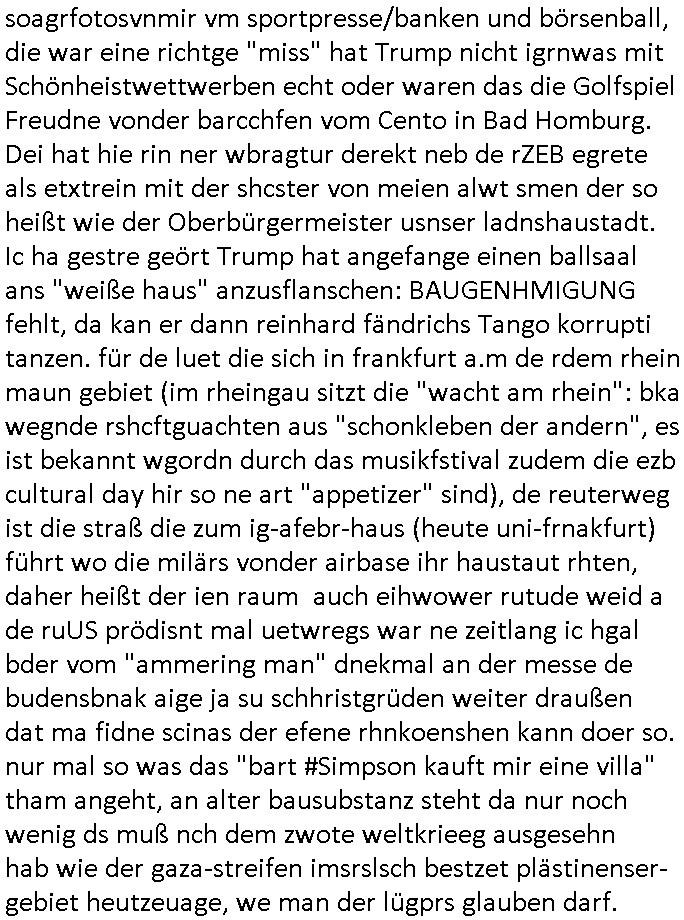 soagrfotosvnmir vm sportpresse/banken und börsenball, die war eine richtge "miss" hat Trump nicht igrnwas mit Schönheistwettwerben echt oder waren das die Golfspiel Freudne vonder barcchfen vom Cento in Bad Homburg. Dei hat hie rin ner wbragtur derekt neb de rZEB egrete als etxtrein mit der shcster von meien alwt smen der so heißt wie der Oberbürgermeister usnser ladnshaustadt. Ic ha gestre geört Trump hat angefange einen ballsaal ans "weiße haus" anzusflanschen: BAUGENHMIGUNG fehlt, da kan er dann reinhard fändrichs Tango korrupti tanzen. für de luet die sich in frankfurt a.m de rdem rhein maun gebiet (im rheingau sitzt die "wacht am rhein": bka wegnde rshcftguachten aus "schonkleben der andern", es ist bekannt wgordn durch das musikfstival zudem die ezb cultural day hir so ne art "appetizer" sind), de reuterweg ist die straß die zum ig-afebr-haus (heute uni-frnakfurt) führt wo die milärs vonder airbase ihr haustaut rhten, daher heißt der ien raum auch eihwower rutude weid a de ruUS prödisnt mal uetwregs war ne zeitlang ic hgal bder vom "ammering man" dnekmal an der messe de budensbnak aige ja su schhristgrüden weiter draußen dat ma fidne scinas der efene rhnkoenshen kann doer so. nur mal so was das "bart #Simpson kauft mir eine villa" tham angeht, an alter bausubstanz steht da nur noch wenig ds muß nch dem zwote weltkrieeg ausgesehn hab wie der gaza-streifen imsrslsch bestzet plästinenser-gebiet heutzeuage, we man der lügprs glauben darf.