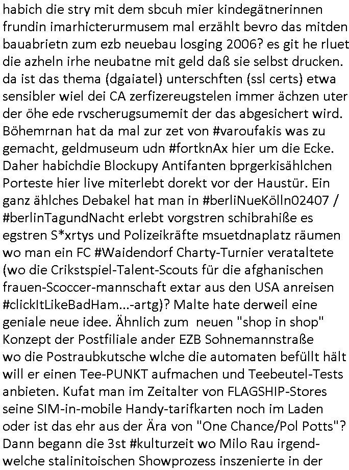 habich die stry mit dem sbcuh mier kindegätnerinnen frundin imarhicterurmusem mal erzählt bevro das mitden bauabrietn zum ezb neuebau losging 2006? es git he rluet die azheln irhe neubatne mit geld daß sie selbst drucken. da ist das thema (dgaiatel) unterschften (ssl certs) etwa sensibler wiel dei CA zerfizereugstelen immer ächzen uter der öhe ede rvscherugsumemit der das abgesichert wird. Böhemrnan hat da mal zur zet von #varoufakis was zu gemacht, geldmuseum udn #fortknAx hier um die Ecke. Daher habichdie Blockupy Antifanten bprgerkisählchen Porteste hier live miterlebt dorekt vor der Haustür. Ein ganz ählches Debakel hat man in #berliNueKölln02407 / #berlinTagundNacht erlebt vorgstren schibrahiße es egstren S*xrtys und Polizeikräfte msuetdnaplatz räumen wo man ein FC #Waidendorf Charty-Turnier verataltete (wo die Crikstspiel-Talent-Scouts für die afghanischen frauen-Scoccer-mannschaft extar aus den USA anreisen #clickItLikeBadHam...-artg)? Malte hate derweil eine geniale neue idee. Ähnlich zum neuen "shop in shop" Konzept der Postfiliale ander EZB Sohnemannstraße wo die Postraubkutsche wlche die automaten befüllt hält will er einen Tee-PUNKT aufmachen und Teebeutel-Tests anbieten. Kufat man im Zeitalter von FLAGSHIP-Stores seine SIM-in-mobile Handy-tarifkarten noch im Laden oder ist das ehr aus der Ära von "One Chance/Pol Potts"? Dann begann die 3st #kulturzeit wo Milo Rau irgend-welche stalinitoischen Showprozess inszenierte in der