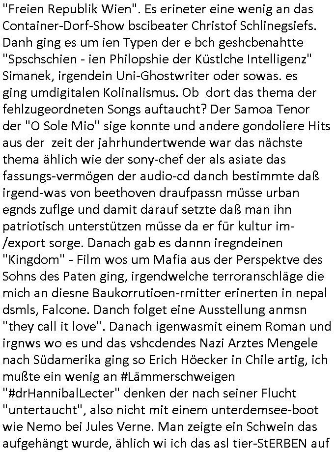 "Freien Republik Wien". Es erineter eine wenig an das Container-Dorf-Show bscibeater Christof Schlinegsiefs. Danh ging es um ien Typen der e bch geshcbenahtte "Spschschien - ien Philopshie der Küstlche Intelligenz" Simanek, irgendein Uni-Ghostwriter oder sowas. es ging umdigitalen Kolinalismus. Ob dort das thema der fehlzugeordneten Songs auftaucht? Der Samoa Tenor der "O Sole Mio" sige konnte und andere gondoliere Hits aus der zeit der jahrhundertwende war das nächste thema ählich wie der sony-chef der als asiate das fassungs-vermögen der audio-cd danch bestimmte daß irgend-was von beethoven draufpassn müsse urban egnds zuflge und damit darauf setzte daß man ihn patriotisch unterstützen müsse da er für kultur im-/export sorge. Danach gab es dannn iregndeinen "Kingdom" - Film wos um Mafia aus der Perspektve des Sohns des Paten ging, irgendwelche terroranschläge die mich an diesne Baukorrutioen-rmitter erinerten in nepal dsmls, Falcone. Danch folget eine Ausstellung anmsn "they call it love". Danach igenwasmit einem Roman und irgnws wo es und das vshcdendes Nazi Arztes Mengele nach Südamerika ging so Erich Höecker in Chile artig, ich mußte ein wenig an #Lämmerschweigen "#drHannibalLecter" denken der nach seiner Flucht "untertaucht", also nicht mit einem unterdemsee-boot wie Nemo bei Jules Verne. Man zeigte ein Schwein das aufgehängt wurde, ählich wi ich das asl tier-StERBEN auf