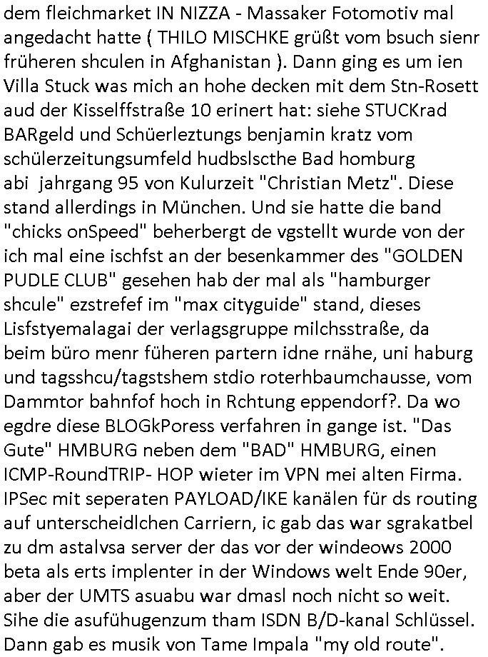 dem fleichmarket IN NIZZA - Massaker Fotomotiv mal angedacht hatte ( THILO MISCHKE grüßt vom bsuch sienr früheren shculen in Afghanistan ). Dann ging es um ien Villa Stuck was mich an hohe decken mit dem Stn-Rosett aud der Kisselffstraße 10 erinert hat: siehe STUCKrad BARgeld und Schüerleztungs benjamin kratz vom schülerzeitungsumfeld hudbslscthe Bad homburg abi jahrgang 95 von Kulurzeit "Christian Metz". Diese stand allerdings in München. Und sie hatte die band "chicks onSpeed" beherbergt de vgstellt wurde von der ich mal eine ischfst an der besenkammer des "GOLDEN PUDLE CLUB" gesehen hab der mal als "hamburger shcule" ezstrefef im "max cityguide" stand, dieses Lisfstyemalagai der verlagsgruppe milchsstraße, da beim büro menr füheren partern idne rnähe, uni haburg und tagsshcu/tagstshem stdio roterhbaumchausse, vom Dammtor bahnfof hoch in Rchtung eppendorf?. Da wo egdre diese BLOGkPoress verfahren in gange ist. "Das Gute" HMBURG neben dem "BAD" HMBURG, einen ICMP-RoundTRIP- HOP wieter im VPN mei alten Firma. IPSec mit seperaten PAYLOAD/IKE kanälen für ds routing auf unterscheidlchen Carriern, ic gab das war sgrakatbel zu dm astalvsa server der das vor der windeows 2000 beta als erts implenter in der Windows welt Ende 90er, aber der UMTS asuabu war dmasl noch nicht so weit. Sihe die asufühugenzum tham ISDN B/D-kanal Schlüssel. Dann gab es musik von Tame Impala "my old route".