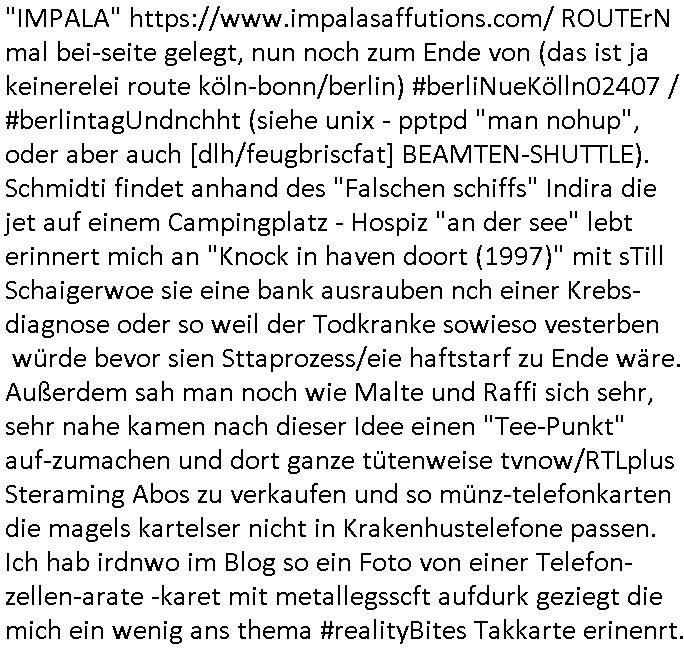 "IMPALA" https://www.impalasaffutions.com/ ROUTErN mal bei-seite gelegt, nun noch zum Ende von (das ist ja keinerelei route köln-bonn/berlin) #berliNueKölln02407 / #berlintagUndnchht (siehe unix - pptpd "man nohup", oder aber auch [dlh/feugbriscfat] BEAMTEN-SHUTTLE). Schmidti findet anhand des "Falschen schiffs" Indira die jet auf einem Campingplatz - Hospiz "an der see" lebt erinnert mich an "Knock in haven doort (1997)" mit sTill Schaigerwoe sie eine bank ausrauben nch einer Krebs- diagnose oder so weil der Todkranke sowieso vesterben würde bevor sien Sttaprozess/eie haftstarf zu Ende wäre. Außerdem sah man noch wie Malte und Raffi sich sehr, sehr nahe kamen nach dieser Idee einen "Tee-Punkt" auf-zumachen und dort ganze tütenweise tvnow/RTLplus Steraming Abos zu verkaufen und so münz-telefonkarten die magels kartelser nicht in Krakenhustelefone passen. Ich hab irdnwo im Blog so ein Foto von einer Telefon-zellen-arate -karet mit metallegsscft aufdurk geziegt die mich ein wenig ans thema #realityBites Takkarte erinenrt.