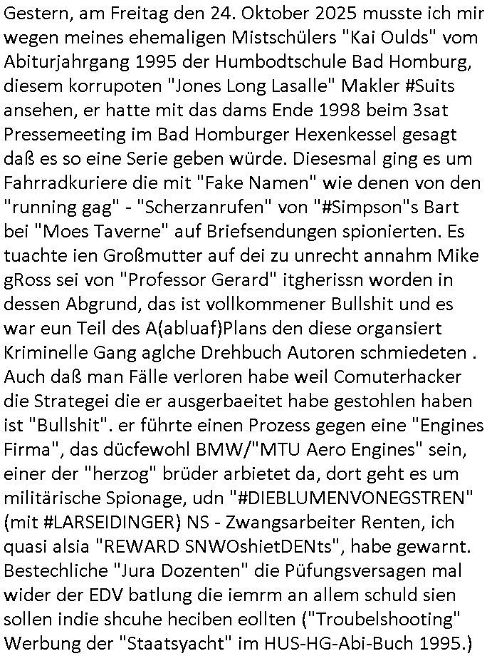 25.10.2025 03:30 Gestern, am Freitag den 24. Oktober 2025 musste ich mir wegen meines ehemaligen Mistschülers "Kai Oulds" vom Abiturjahrgang 1995 der Humbodtschule Bad Homburg, diesem korrupoten "Jones Long Lasalle" Makler #Suits ansehen, er hatte mit das dams Ende 1998 beim 3sat Pressemeeting im Bad Homburger Hexenkessel gesagt daß es so eine Serie geben würde. Diesesmal ging es um Fahrradkuriere die mit "Fake Namen" wie denen von den "running gag" - "Scherzanrufen" von "#Simpson"s Bart bei "Moes Taverne" auf Briefsendungen spionierten. Es tuachte ien Großmutter auf dei zu unrecht annahm Mike gRoss sei von "Professor Gerard" itgherissn worden in dessen Abgrund, das ist vollkommener Bullshit und es war eun Teil des A(abluaf)Plans den diese organsiert Kriminelle Gang aglche Drehbuch Autoren schmiedeten . Auch daß man Fälle verloren habe weil Comuterhacker die Strategei die er ausgerbaeitet habe gestohlen haben ist "Bullshit". er führte einen Prozess gegen eine "Engines Firma", das dücfewohl BMW/"MTU Aero Engines" sein, einer der "herzog" brüder arbietet da, dort geht es um militärische Spionage, udn "#DIEBLUMENVONEGSTREN" (mit #LARSEIDINGER) NS - Zwangsarbeiter Renten, ich quasi alsia "REWARD SNWOshietDENts", habe gewarnt. Bestechliche "Jura Dozenten" die Püfungsversagen mal wider der EDV batlung die iemrm an allem schuld sien sollen indie shcuhe heciben eollten ("Troubelshooting" Werbung der "Staatsyacht" im HUS-HG-Abi-Buch 1995.) Es gab dann einen Erwürge-Mordversuch an der Tank-stelle was mich sehr and en Versuch mich zu erwürgen hier in mien appatment uweit ienr Aral-Tanke erinnert. "Piotr Michalek" dieser ilegale(?) Untermieter von "Katja Zajac" aus dem Appartement unter mir, das LG verfahren 2016 mit VorsRi Kulik und OSta Dr. König. Der gudnd afür daß Bruckmaier sien Jur prfüng nichts cffte ist daß er zuvil marihauankosumiert undüer disen Konsum Beschaffungs-kriminaliäts Kontakt zur orgsierte Kriminalität hat. Siehe auch Melanie Boss, die Hebamme mit adm abhägigen FrudnUlrch hartweig die bei Entüfhrung meines Kindes halfen. Ich glabe der Oktoebrfest Amoklauf in Müchen von diesem Bombelegr daskönnte Bruckmaeier gewesen sein der Ter der meinen Onkel Wolfgang der dort lebte (flusgcher, Jagdflieger, BMW Kleinstakionär, siehe Kita Hochzeit "Christina Kreuzer" - aus der kappesgasse Bad homburg Oebr-Erlenbach - Erbschleicherei) ausplündern wollte. Der Schwimmstar(?) Betrügeranwalt Mike gRoss wurd nicht vom prüfenden Antfanten Professor epresst, der Verhder wolte daß Neo-Nazis an Schaltstellen der machtkomen um rtsmistche Osblcok Amrustzderer daran zu hindern diese zu infiltrieren wie etwa der "Bella Ciao" getätet italien Kommunisten-Widerstäder-Partisan-Enkel. Vendetta/Rache gegen zu plüdende Wehrmachts-soldaten. Es ging bei #Suits um eien entgleist seienden "Zug", das steht wohl für einen VPN-Tunnel dieses-mal, angeblich wegen #Sensoren die nicht fukioerten, damit ist aber etwas anders gemeint nämlich um Betriebs-spionage mit Windows .10/.11 und Office-Paket Lizenzen, dieses DRM Verfahren mit einer Art "Portable-Apps" Leihbibliothek. "Donna" bescffte illegal Beweise indem sie ich als eine Bundesbeamtin ausgab. Dadurch platzte der Prozess, sie landete fast wgebn Betrugs (oder Amtsan-massung) im Knast. Sowas muß man schon schlaiuer sntellen, indem man etwa wie ich den Artikel 20 Absatz 4 Grundgesetz bemüht wenn man das kann, wie die bhrdnmist gebaut haben, zur wderhstellungder öfflichenornug, dann kannamnsich slebt Ämtergeben, aber dafür muß man Desucher sin, heir ging es aber auch oft um Asylbetrüger die ihre abschiebungen verhindern wollten oder Israeli/ Juden die vehrider daß sie zur wehrpflicht herangezogen werden, dann aber schon damsl 1998 den Gaza Streifen bombardieren lassen wollten und Krieg in der Ukraine. Der Typ vonder auläderbehörde wollte aber nur solche Kinder von llegalen im Land behalten die hier auch auf-gewachsen (sozailsiert worden) waren. Daß die Oma verhiderte daß "Mice gRoss" ien Diplom erheilt hate damit zu tund aß sie ihn zwingen wollte sie zu pflegen, sie wollte mit demwissn um die gaze shcienrein die er gemachte erpressen daß er sich um sie kümmert im Alter und einen Pflegeberuf ergeft, dazu gab es gern als ich kurz das FrühtsückstV sghenhab ien berucht zum Tahm "mobbing im nedizberich" dort sien einr studi zufolge die angeblche "Kollegen" die schlimsten von allen Berufs-gruppen, kann ich aus der klinik DrBaumstark bestätigen. Angeblich sollte der Betrüger "leVis" (Jörg Schuster?/Stefan Schubert?) der sich via "Mike gRoss" einen Job er-presste die "asche" von Oma ins Büro/Geschäft stecken. Siehe das "Immo Schneider" Metallgesellschaft-Öl Pleite / NS-Enteigunslüge BEUTEgrundstück hinter der alten Oper im Reuterweg Frankfurt a.M. Nuebabaung Thema. Die "100"+"60" Mio faule Verivox-Bausparkasse Kredite rings um "peanuts - die bank zahlt alles". Eienr der parter de rklazlei war so sauer asl ervonall denIrgen erfuhr mit den Lweis ins amt gekomenwar daß er kündigte. Er wollte nicht mit einem Erpresser/Verbrecher zusammen-arbieten. KATJA BADER HAT MAL GESAGT DAS SEI MEINE ROLLE UND DIE MEISN VATERS als die das Drehbuch besprachen, sie steht in Suits wohl für die afrosksncihe kanzleichefin. Diese klage wegen der entgleister Züge duch Zulfere-Mängel (Sabotage mit Madex/Shuttle-PC-Mainbaords aufgrund von Liferegnpässen) war zunächst gescheitert. Es gab da aber noch ganz andere böse Sabotageakte und abspchen DeCIX-Stermaing-Videothenken-feeds nicht ins Netz zu routen 2003 am tag des inszeriert Autounfalls. Was die Klage wegen der "entglsetn Züge anging" hatte man glück, diese meise Verbrecherbande hatte einen Mit-arbeiter vergessen per bestechung "zu kaufen" (DAS SIND ICH UND PIOTR GEWESEN) bei de einem der angeblichen Whistle-blower stellte sich aber heraus daß er permanent "Arbeitgeber" verklagt hatte um an Geld zu kommen. Das war wohl Piotr Dzierzanowskis/Victor Bodnarescus Rolle. Der eige der aufs ien 