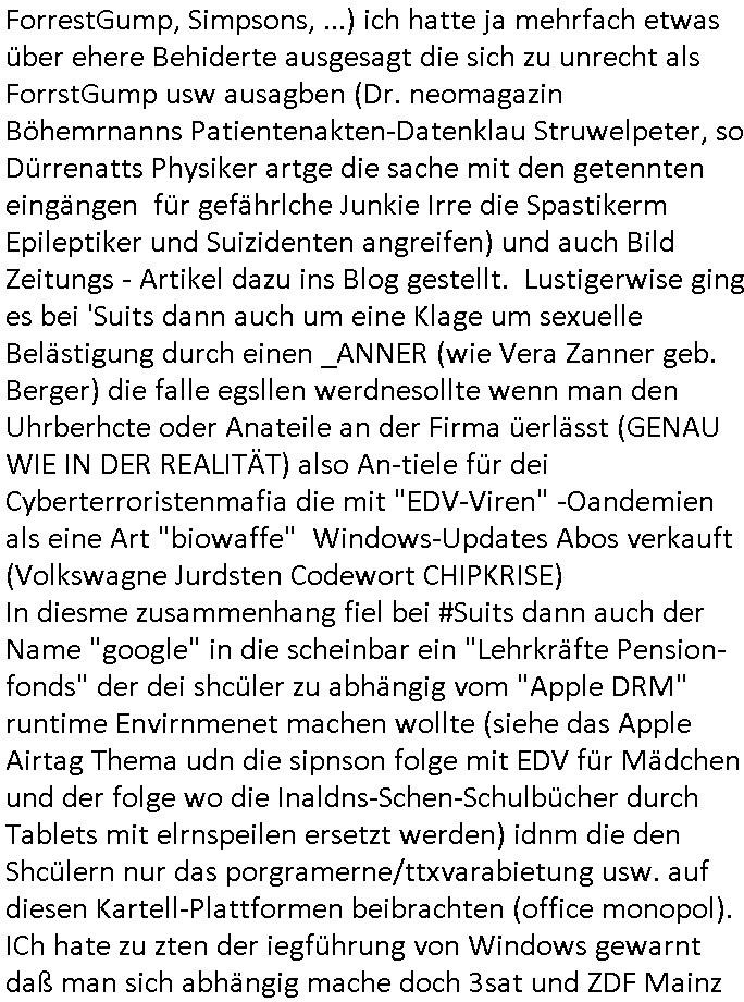 ForrestGump, Simpsons, ...) ich hatte ja mehrfach etwas über ehere Behiderte ausgesagt die sich zu unrecht als ForrstGump usw ausagben (Dr. neomagazin Böhemrnanns Patientenakten-Datenklau Struwelpeter, so Dürrenatts Physiker artge die sache mit den getennten eingängen für gefährlche Junkie Irre die Spastikerm Epileptiker und Suizidenten angreifen) und auch Bild Zeitungs - Artikel dazu ins Blog gestellt. Lustigerwise ging es bei 'Suits dann auch um eine Klage um sexuelle Belästigung durch einen _ANNER (wie Vera Zanner geb. Berger) die falle egsllen werdnesollte wenn man den Uhrberhcte oder Anateile an der Firma üerlässt (GENAU WIE IN DER REALITÄT) also An-tiele für dei Cyberterroristenmafia die mit "EDV-Viren" -Oandemien als eine Art "biowaffe" Windows-Updates Abos verkauft (Volkswagne Jurdsten Codewort CHIPKRISE) In diesme zusammenhang fiel bei #Suits dann auch der Name "google" in die scheinbar ein "Lehrkräfte Pension-fonds" der dei shcüler zu abhängig vom "Apple DRM" runtime Envirnmenet machen wollte (siehe das Apple Airtag Thema udn die sipnson folge mit EDV für Mädchen und der folge wo die Inaldns-Schen-Schulbücher durch Tablets mit elrnspeilen ersetzt werden) idnm die den Shcülern nur das porgramerne/ttxvarabietung usw. auf diesen Kartell-Plattformen beibrachten (office monopol). ICh hate zu zten der iegführung von Windows gewarnt daß man sich abhängig mache doch 3sat und ZDF Mainz