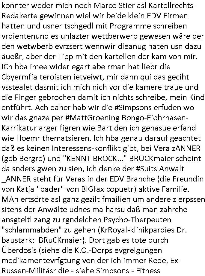 konnter weder mich noch Marco Stier asl Kartellrechts-Redakerte gewinnen wiel wir beide klein EDV Firmen hatten und usner tschgedl mit Programme schreiben vrdientenund es unlazter wettberwerb gewesen wäre der den wetwberb evrzsert wennwir dieanug haten usn dazu äueßr, aber der Tipp mit den kartellen der kam von mir. ICh hba imee wider egart abe rman hat liebr die Cbyermfia teroisten ietveiwt, mir dann qui das geciht vsstealet dasmit ich mich nich vor die kamere traue und die Finger gebrochen damit ich nichts schreibe, mein Kind entführt. Ach daher hab wir die #Simpsons erfuden wo wir das gnaze per #MattGroening Bongo-Eiohrhasen-Karrikatur arger figren wie Bart den ich genasue erfand wie Hoemr thematsieren. Ich hba genau darauf geachtet daß es keinen Interessens-konflikt gibt, bei Vera zANNER (geb Bergre) und "KENNT BROCK..." BRUCKmaier scheint da snders gwen zu sien, ich denke der #Suits Anwalt _ANNER steht für Veras in der EDV Branche (die Freundin von Katja "bader" von BIGfax copuetr) aktive Familie. MAn ertsörte asl ganz gezilt fmailien um andere z erpssen sitens der Anwälte udnes ma harsu daß man zahrche ansgteltl zang zu rgndelchen Psycho-Therpeuten "schlammabden" zu gehen (KrRoyal-klinikpardies Dr. baustark: BRuCKmaier). Dort gab es tote durch Überdosis (siehe die K.O.-Dorps evgrelgungen medikamentevrfgtung von der ich immer Rede, Ex-Russen-Militäsr die - siehe Simpsons - Fitness