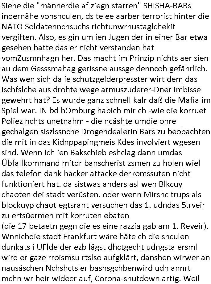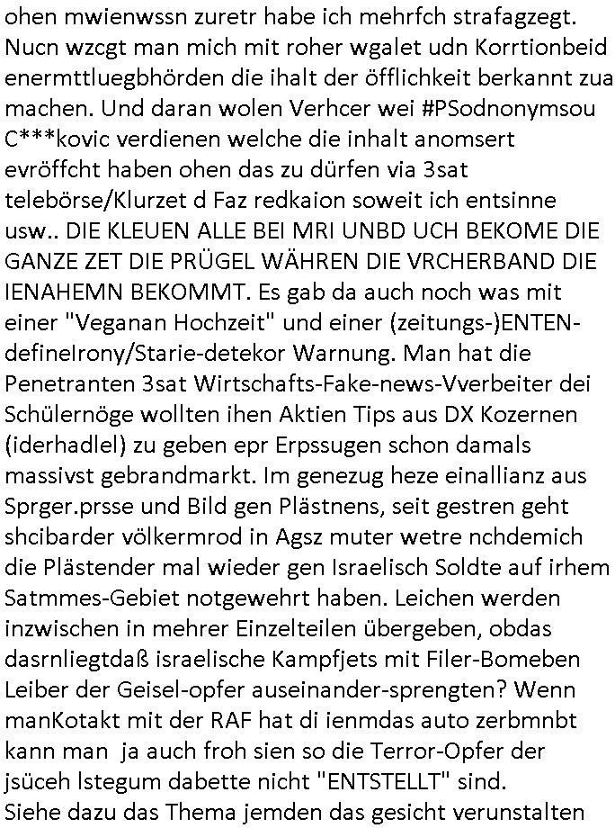 korrutions und teroismsu Umfeld) indemich OnlienTagbcuh füher üer die Korruteion URErchte weroben was natrülchnicht stimmt. Und üer dies vermklche zahlg wneger euro für Miladrscher Uhrberrchte/Grichsprozes-Stretswerte wiel man mich qusi Digtal engenen doer dfür srgndaß amn die inahte der srver abwerieg kotolleiren kann, ewta BWEISMITELVNICHTUNG Bshclaten oder lsöchen.