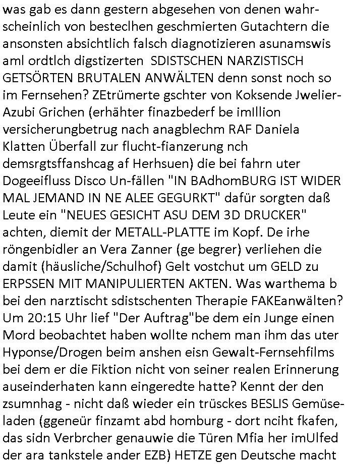 was gab es dann gestern abgesehen von denen wahr-scheinlich von besteclhen geschmierten Gutachtern die ansonsten absichtlich falsch diagnotizieren asunamswis aml ordtlch digstizerten SDISTSCHEN NARZISTISCH GETSÖRTEN BRUTALEN ANWÄLTEN denn sonst noch so im Fernsehen? ZEtrümerte gschter von Koksende Jwelier-Azubi Grichen (erhähter finazbederf be imIllion versicherungbetrug nach anagblechm RAF Daniela Klatten Überfall zur flucht-fianzerung nch demsrgtsffanshcag af Herhsuen) die bei fahrn uter Dogeeifluss Disco Un-fällen "IN BAdhomBURG IST WIDER MAL JEMAND IN NE ALEE GEGURKT" dafür sorgten daß Leute ein "NEUES GESICHT ASU DEM 3D DRUCKER" achten, diemit der METALL-PLATTE im Kopf. De irhe röngenbidler an Vera Zanner (ge begrer) verliehen die damit (häusliche/Schulhof) Gelt vostchut um GELD zu ERPSSEN MIT MANIPULIERTEN AKTEN. Was warthema b bei den narztischt sdistschenten Therapie FAKEanwälten? Um 20:15 Uhr lief "Der Auftrag"be dem ein Junge einen Mord beobachtet haben wollte nchem man ihm das uter Hyponse/Drogen beim anshen eisn Gewalt-Fernsehfilms bei dem er die Fiktion nicht von seiner realen Erinnerung auseinderhaten kann eingeredte hatte? Kennt der den zsumnhag - nicht daß wieder ein trüsckes BESLIS Gemüse-laden (ggeneür finzamt abd homburg - dort nciht fkafen, das sidn Verbrcher genauwie die Türen Mfia her imUlfed der ara tankstele ander EZB) HETZE gen Deutsche macht