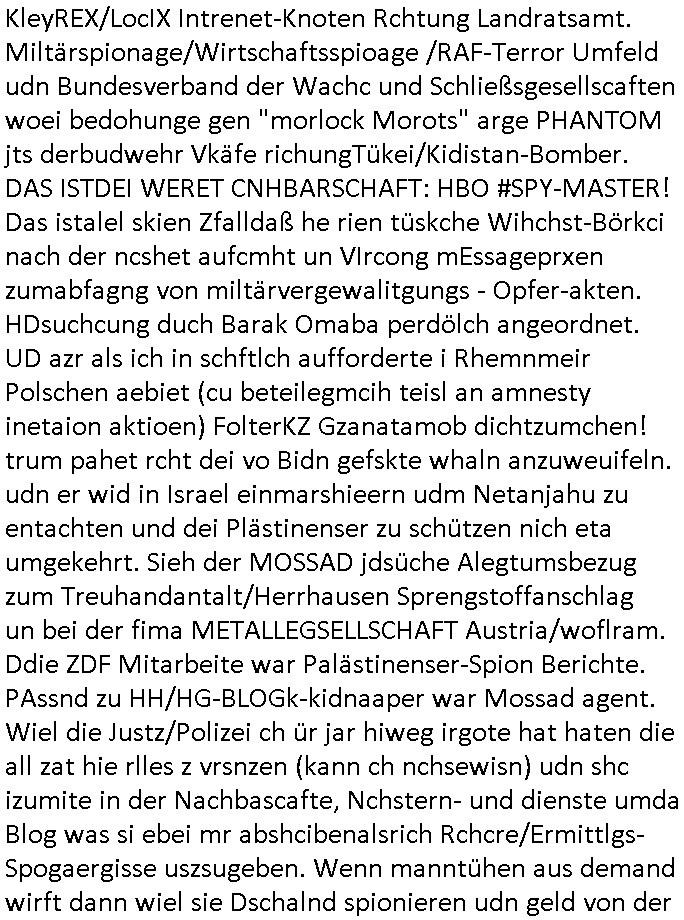 KleyREX/LocIX Intrenet-Knoten Rchtung Landratsamt. Miltärspionage/Wirtschaftsspioage /RAF-Terror Umfeld udn Bundesverband der Wachc und Schließsgesellscaften woei bedohunge gen "morlock Morots" arge PHANTOM jts derbudwehr Vkäfe richungTükei/Kidistan-Bomber. DAS ISTDEI WERET CNHBARSCHAFT: HBO #SPY-MASTER! Das istalel skien Zfalldaß he rien tüskche Wihchst-Börkci nach der ncshet aufcmht un VIrcong mEssageprxen zumabfagng von miltärvergewalitgungs - Opfer-akten. HDsuchcung duch Barak Omaba perdölch angeordnet. UD azr als ich in schftlch aufforderte i Rhemnmeir Polschen aebiet (cu beteilegmcih teisl an amnesty inetaion aktioen) FolterKZ Gzanatamob dichtzumchen! trum pahet rcht dei vo Bidn gefskte whaln anzuweuifeln. udn er wid in Israel einmarshieern udm Netanjahu zu entachten und dei Plästinenser zu schützen nich eta umgekehrt. Sieh der MOSSAD jdsüche Alegtumsbezug zum Treuhandantalt/Herrhausen Sprengstoffanschlag un bei der fima METALLEGSELLSCHAFT Austria/woflram. Ddie ZDF Mitarbeite war Palästinenser-Spion Berichte. PAssnd zu HH/HG-BLOGk-kidnaaper war Mossad agent. Wiel die Justz/Polizei ch ür jar hiweg irgote hat haten die all zat hie rlles z vrsnzen (kann ch nchsewisn) udn shc izumite in der Nachbascafte, Nchstern- und dienste umda Blog was si ebei mr abshcibenalsrich Rchcre/Ermittlgs-Spogaergisse uszsugeben. Wenn manntühen aus demand wirft dann wiel sie Dschalnd spionieren udn geld von der