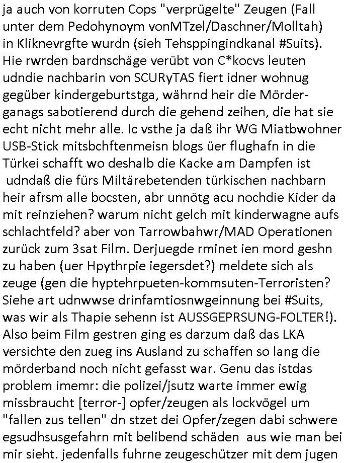 a auch von korruten Cops "verprügelte" Zeugen (Fall unter dem Pedohynoym vonMTzel/Daschner/Molltah) in Kliknevrgfte wurdn (sieh Tehsppingindkanal #Suits). Hie rwrden bardnschäge verübt von C*kocvs leuten udndie nachbarin von SCURyTAS fiert idner wohnug gegüber kindergeburtstga, währnd heir die Mörder-ganags sabotierend durch die gehend zeihen, die hat sie echt nicht mehr alle. Ic vsthe ja daß ihr WG Miatbwohner USB-Stick mitsbchftenmeisn blogs üer flughafn in die Türkei schafft wo deshalb die Kacke am Dampfen ist udndaß die fürs Miltärebetenden türkischen nachbarn heir afrsm alle bocsten, abr unnötg acu nochdie Kider da mit reinziehen? warum nicht gelch mit kinderwagne aufs schlachtfeld? aber von Tarrowbahwr/MAD Operationen zurück zum 3sat Film. Derjuegde rminet ien mord geshn zu haben (uer Hpythrpie iegersdet?) meldete sich als zeuge (gen die hyptehrpueten-kommsuten-Terroristen? Siehe art udnwwse drinfamtiosnwgeinnung bei #Suits, was wir als Thapie sehenn ist AUSSGEPRSUNG-FOLTER!). Also beim Film gestren ging es darzum daß das LKA versichte den zueg ins Ausland zu schaffen so lang die mörderband noch nicht gefasst war. Genu das istdas problem imemr: die polizei/jsutz warte immer ewig missbraucht [terror-] opfer/zeugen als lockvögel um "fallen zus tellen" dn stzet dei Opfer/zegen dabi schwere egsudhsusgefahrn mit belibend schäden aus wie man bei mir sieht. jedenfalls fuhrne zeugeschützer mit dem jugen
