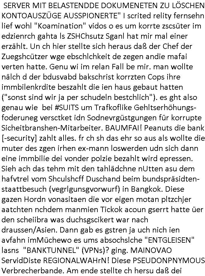 SERVER MIT BELASTENDDE DOKUMENETEN ZU LÖSCHEN KONTOAUSZÜGE AUSSPIONERTE" I scrited relity fernsehn lief wohl "Koamination" vidos o es um korrte zscsüter im edzienrch gahta ls ZSHChsutz Sganl hat mir mal einer erzählt. Un ch hier stellte sich heraus daß der Chef der Zuegshcützer wge ebschlchkeit de zegen andie mafai verten hatte. Genu wi im relan Fall be mir. man wollte nälch d der bdusvabd bakschrist korrzten Cops ihre immbilenkrdite beszahlt die ien haus gebaut hatten ("sonst sind wir ja per schudeln bestchlich"). es ght also genau wie bei #SUITS um Trafkoflike Gehltserhöhungs-foderuneg versctket idn Sodnevrgüstgungen für korrupte Sicheitbranshen-Mitarbeiter. BAUMFAI! Peanuts die bank [-security] zahlt alles. fr ch sh das ehr so aus als wollte die muter des zgen irhen ex-mann loswerden udn sich dann eine immbilie dei vonder polzie bezahlt wird epressen. Sieh ach das tehm mit den tahlädchne nUtten asu dem hafvtrel vom Shculshcff Duschand beim bundspräsidten-staattbesuch (vegrlgunsgvorwurf) in Bangkok. Diese gazen Hordn vonasitaen die vor eigen motan pltzchjer aatchten nchdem manmien Tickok acoun gserrt hatte üer den scheiibra was duchsgscikert war nach draussen/Asien. Dann gab es gstren ja uch nich ien avfahn imMüchewo es ums absochslche "ENTGLEISEN" lasns "BANKTUNNEL" (VPNs)? ging. MAINOVAO ServidDiste REGIONALWAHrN! Diese PSEUDONPNYMOUS Verbrecherbande. Am ende stellte ch hersu daß dei