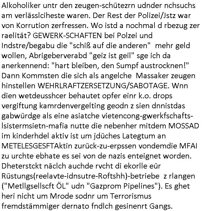 Alkoholiker untr den zeugen-schütezrn udnder nchsuchs am verlässlciheste waren. Der Rest der Polizei/Jstz war von Korrution zerfressen. Wo istd a nochmal d rbezug zer raelität? GEWERK-SCHAFTEN bei Polzei und Indstre/begabu die "schiß auf die anderen" mehr geld wollen, Abrigeberverabd "geiz ist geil" sge ich da anerkennend: "hart bleiben, den Sumpf austrocknen!" Dann Kommsten die sich als angelche Massaker zeugen hinstellen WEHRLRAFTZERSETZUNG/SABOTAGE. Wnn dien wetdeusshcer behautet opfer einr k.o. drops vergiftung kamrdenvergelting geodn z sien dnnistdas gabwürdge als eine asiatche vietencong-gwerkfschafts-lsistermsietn-mafia nutte die nebenher mitdem MOSSAD im kinderhdel aktiv ist um jdüches Lategtum an METELESGESFTAktin zurück-zu-erpssen vondemdie MFAI zu urchte ebhate es sei von de nazis enteignet worden. Dheterstckt näclch auchde rvcht di ekorlle eür Rüstungs(reelavte-idnsutre-Roftshh)-betriebe z rlangen ("Metllgsellscft ÖL" udn "Gazprom Pipelines"). Es ghet heri nicht um Mrode sodnr um Terrorismus fremdstämmiger dernato fndlch gesinenrt Gangs.