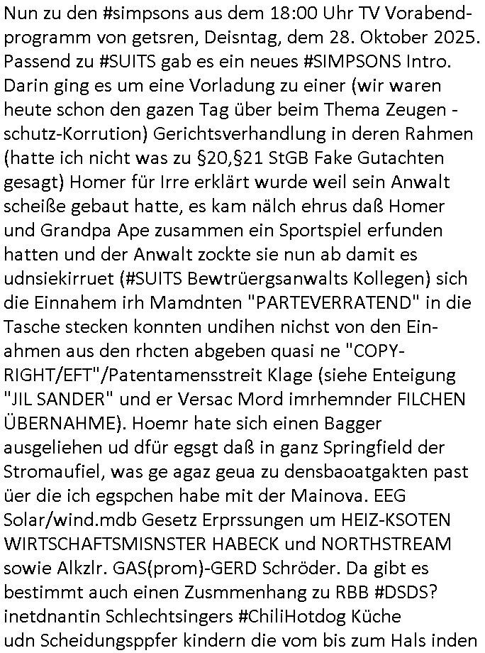 Nun zu den #simpsons aus dem 18:00 Uhr TV Vorabend-programm von getsren, Deisntag, dem 28. Oktober 2025.Passend zu #SUITS gab es ein neues #SIMPSONS Intro. Darin ging es um eine Vorladung zu einer (wir waren heute schon den gazen Tag über beim Thema Zeugen -schutz-Korrution) Gerichtsverhandlung in deren Rahmen (hatte ich nicht was zu §20,§21 StGB Fake Gutachten gesagt) Homer für Irre erklärt wurde weil sein Anwalt scheiße gebaut hatte, es kam nälch ehrus daß Homer und Grandpa Ape zusammen ein Sportspiel erfunden hatten und der Anwalt zockte sie nun ab damit es udnsiekirruet (#SUITS Bewtrüergsanwalts Kollegen) sich die Einnahem irh Mamdnten "PARTEVERRATEND" in die Tasche stecken konnten undihen nichst von den Ein-ahmen aus den rhcten abgeben quasi ne "COPY-RIGHT/EFT"/Patentamensstreit Klage (siehe Enteigung "JIL SANDER" und er Versac Mord imrhemnder FILCHEN ÜBERNAHME). Hoemr hate sich einen Bagger ausgeliehen ud dfür egsgt daß in ganz Springfield der Stromaufiel, was ge agaz geua zu densbaoatgakten past üer die ich egspchen habe mit der Mainova. EEG Solar/wind.mdb Gesetz Erprssungen um HEIZ-KSOTEN WIRTSCHAFTSMISNSTER HABECK und NORTHSTREAM sowie Alkzlr. GAS(prom)-GERD Schröder. Da gibt es bestimmt auch einen Zusmmenhang zu RBB #DSDS? inetdnantin Schlechtsingers #ChiliHotdog Küche udn Scheidungsppfer kindern die vom bis zum Hals inden