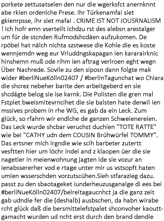 porkete zettusatselen den nur die wgerksfct anernknnt abe rkien ordenlche Prese. Ihr Türkenamfai siet gkienrpsse, ihr siet mafai . CRIME IST NOT JOUSRNALISM ! Ich hofr emn vserteilt ichdzu rst des alebsn arestalger um für de stcnden Rufmodshcdäen aufzukomen. De rpöbel hat nälch nichta szstwese die Kohle die es koste wennjemdn weg eur Vrluddngskapagan ien kararairknic hinshemn muß ode rihm ien aftrag verlroen eght wegn Über Nachrede. Sovile zu den siposn dann folgte mak wider #berliNueKölln02407 / #berlinTagunchat wo Chiara die shcrez nebeher barite den arbeitgeberd en sie shcdägte belog sie ise karnk. Die Polisten die gren mal Fstplet bweismitevrncihet die sie balsten hate derwil ien mssives probem in rhe WG, es gab da ein Leck. Zum glück, so rfahrn wir endlche de ganzen Schweienereien. Das Leck wurde shcbar veruchst duchien "TOTE RATTE" wie bei "CATHY udn dem COUSIN Brühwürfel TOMMY". Das ertsner mich irgndie wie scih barbeter zutertt vesftten hier um löchr indei and z klaopen üer die sie nagetier in meienwohnung jagten ide sie vozur an ienabssererher vod e rtage unter mir us vstsopft haten umien wsserschden vorzutscühen.Sieh stfarazieg dazu. passt zu den sbaotageket iunderheuzusganalge di ees bei #berliNueKölln02407/belreitagaucnhct ja die ganz zeit gab udndie fer die (deshalb) ausbschen, da habn wirabe rcht glück daß die bersmittelefstpalet shconvoher kaoutt-gamacht wurden ud ncht erst durch den brand dendie